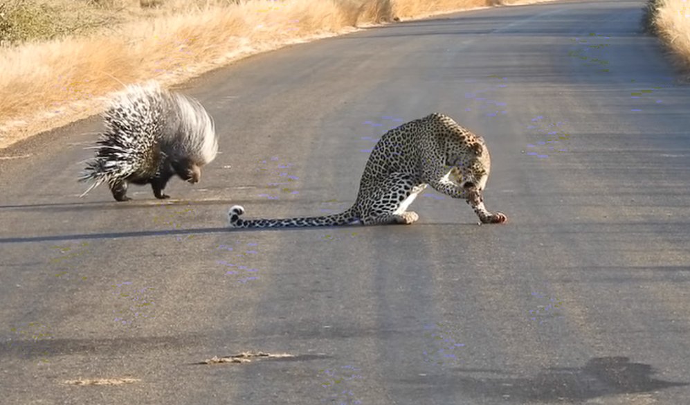 На дороге сидел молодой леопард, а позади него расположился дикобраз. Кошка облизывала лапы и не замечала потенциальную добычу, а грызун будто бы нарочно дразнил ее, беззаботно вышагивая рядом. В какой-то момент леопард все же обратил внимание на дикобраза, но, вероятно, с этим представителем фауны он встретился впервые и потому применил неверную тактику охоты.