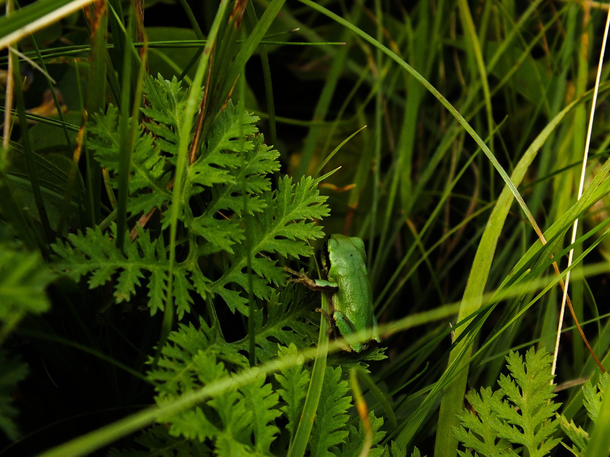 Лягушка, которую и не сразу заметишь,спряталась в сочной зеленоватой траве.