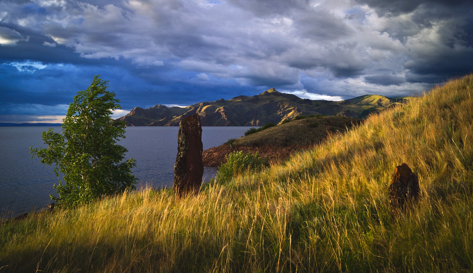 Стеллы древнего,полуразрушенного кургана,подмываемого водами Красноярского водохранилища.Республика Хакасия.