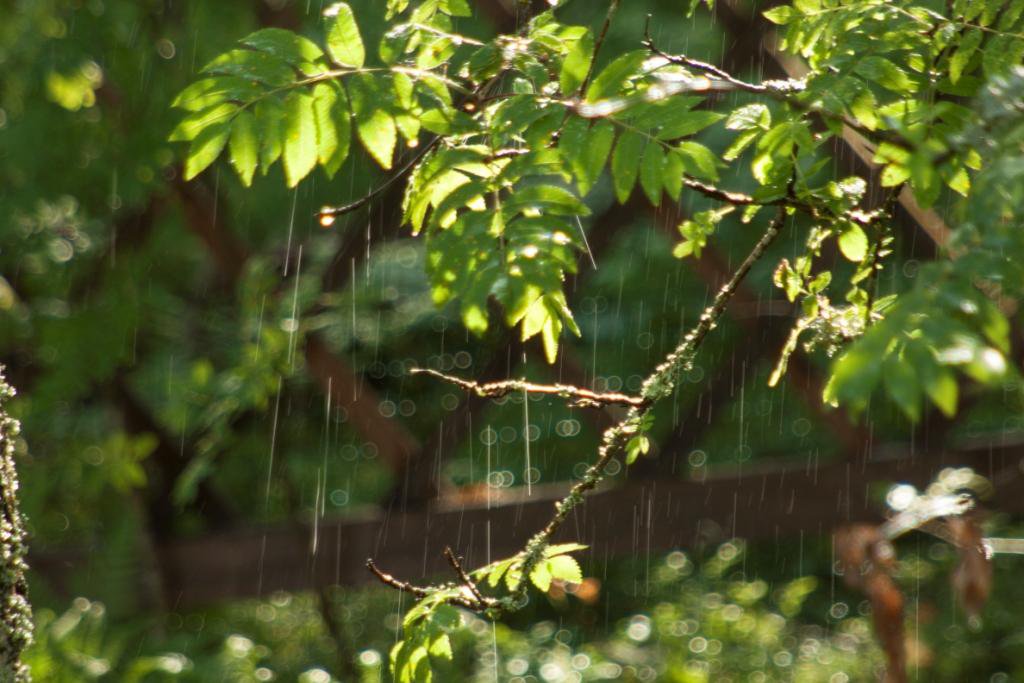 с листьев капали капли дождя, подсвеченные солнцем. было очень красиво.