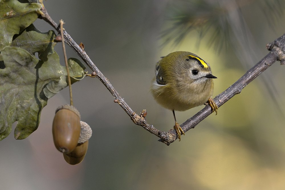 Королек настолько маленькая птичка, что желуди рядом с ним выглядят большими