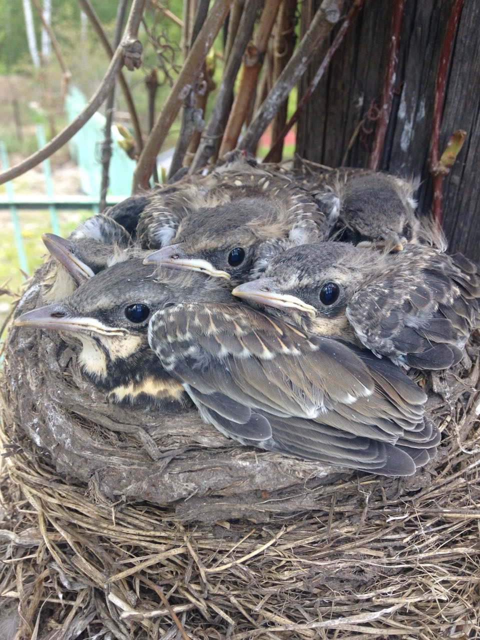 Птенцы дрозда в гнезде уже не помещаются готовы к вылету из гнезда