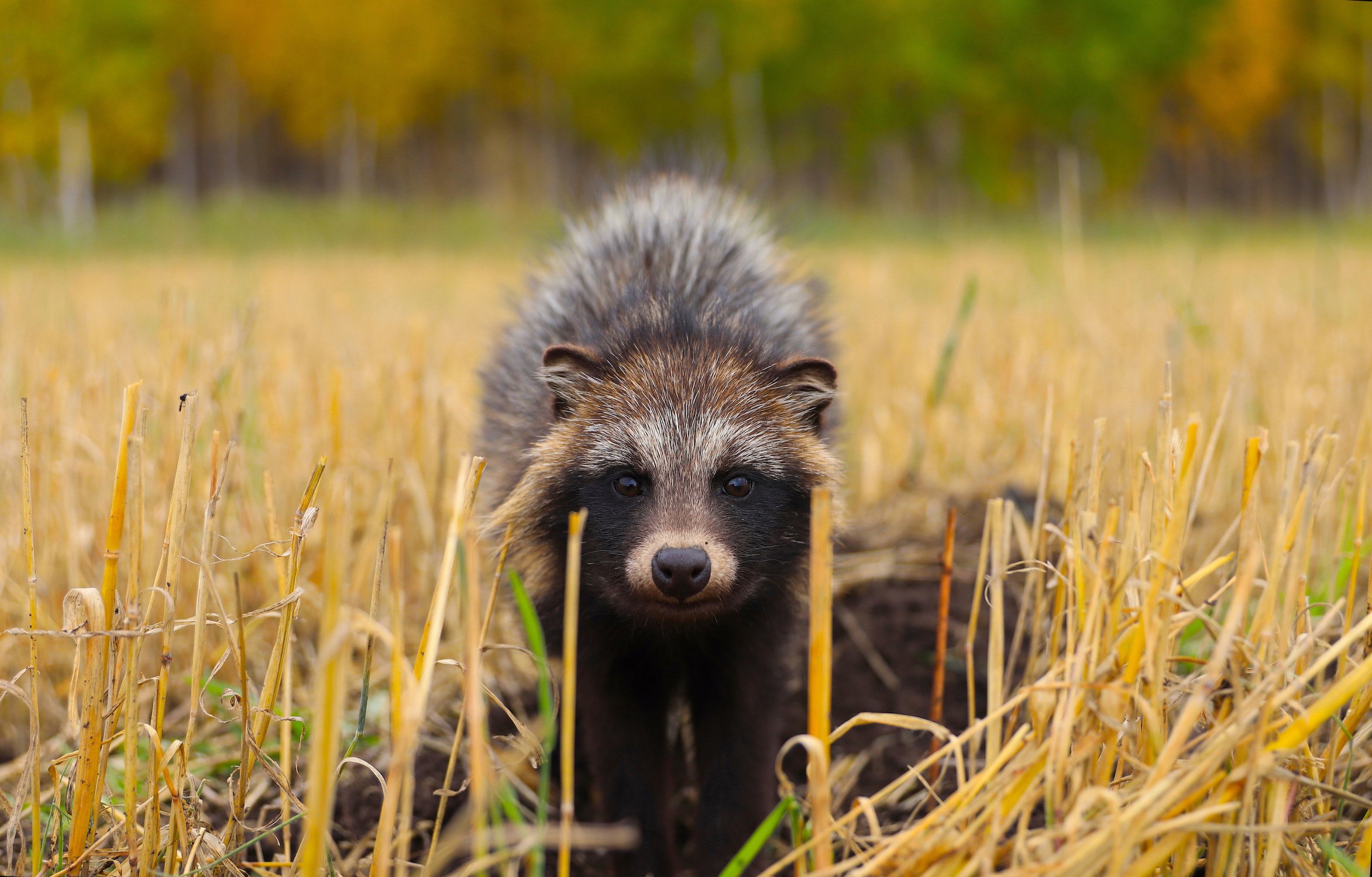 Щенок енотовидной собаки в поисках мышки полевки на поле.