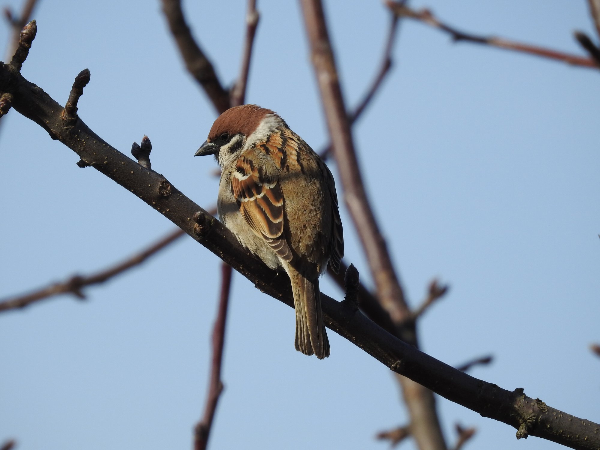 Воробей на ветках яблони.