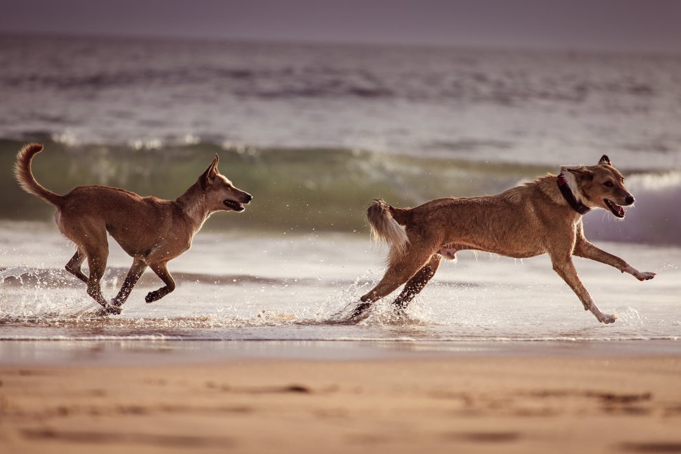 На пляже живет очень много энергичных собак.