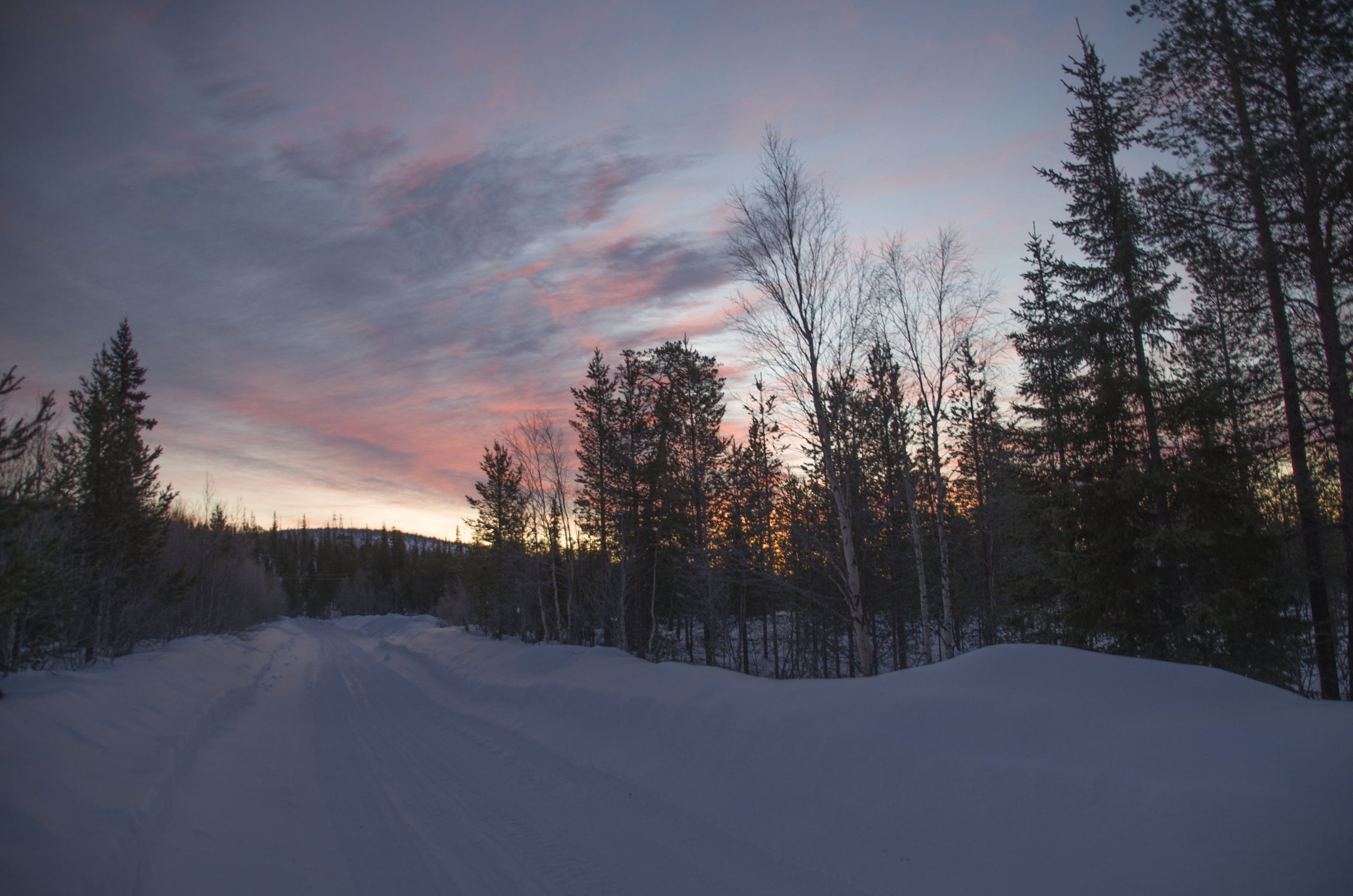 Мурманская обл. Дорога на Чунозерскую усадьбу Лапландского заповедника. Первые лучи солнца после долгой полярной ночи.