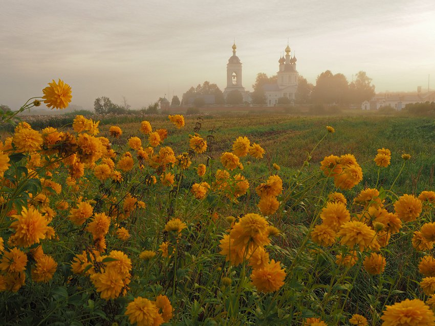 Конец августа, раннее утро, туман. Золотые шары напоминают, что лето подходит к концу. На заднем плане Успенский женский монастырь села Дунилово.