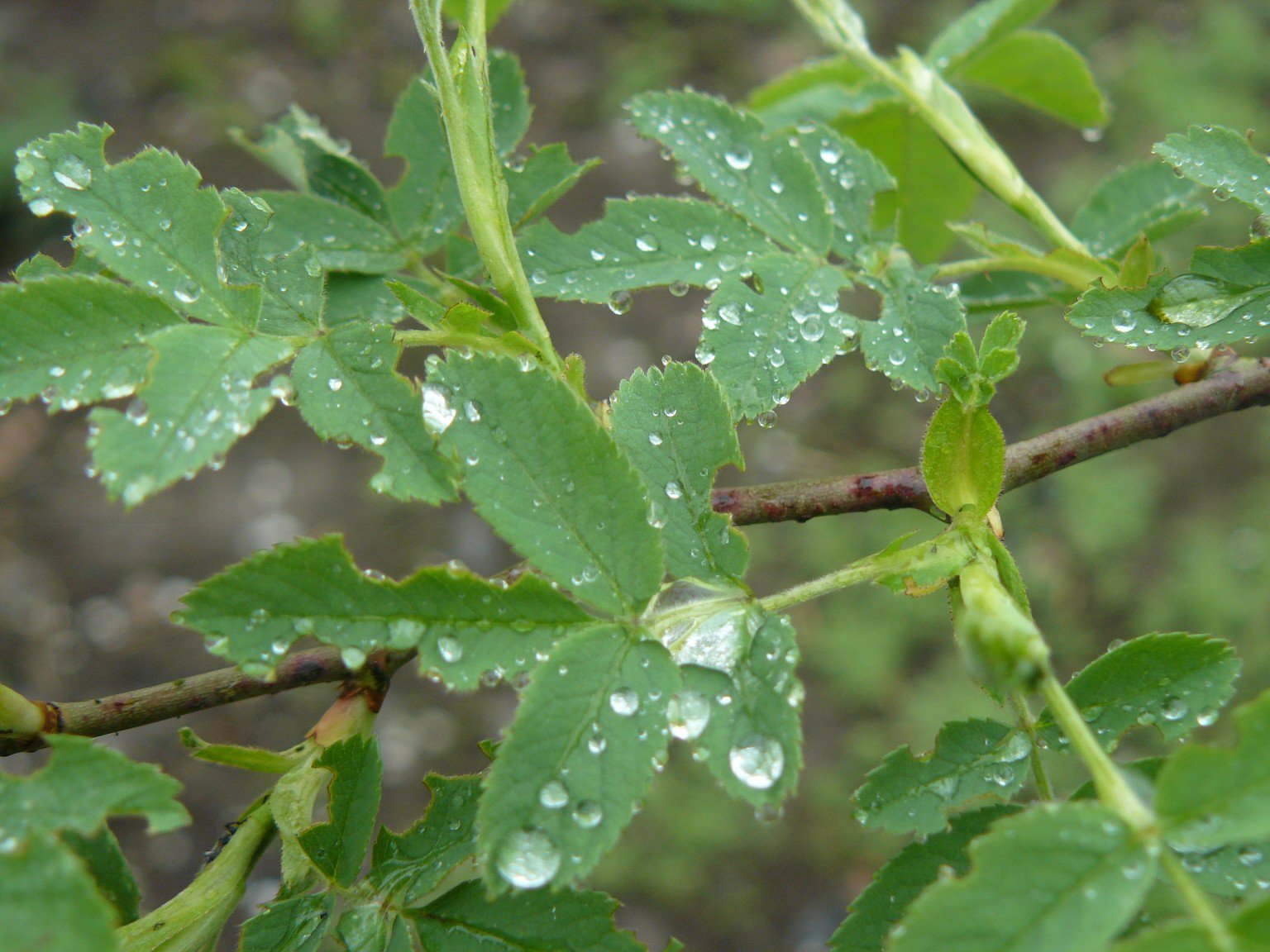 Капли дождя на листиках шиповника.