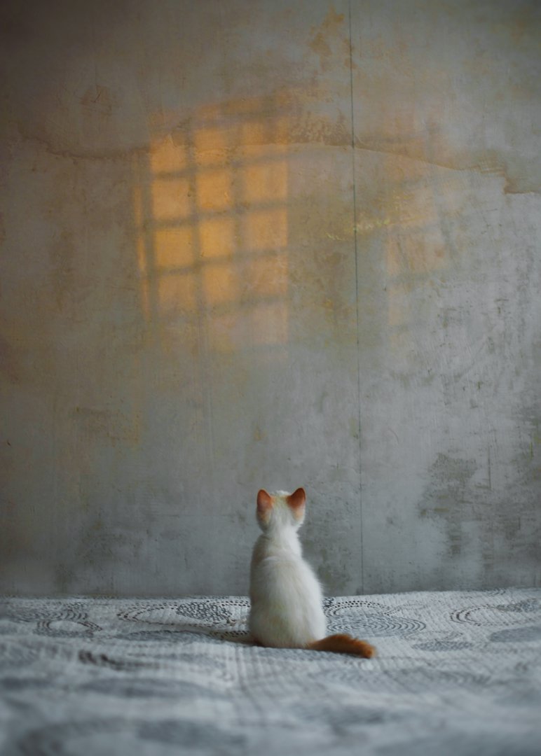 вечер, окна выходят на теневую сторону, но бывает так, что окна соседнего дома отражают вечерний свет к нам. Смела, так зовут котенка, заинтересовалась