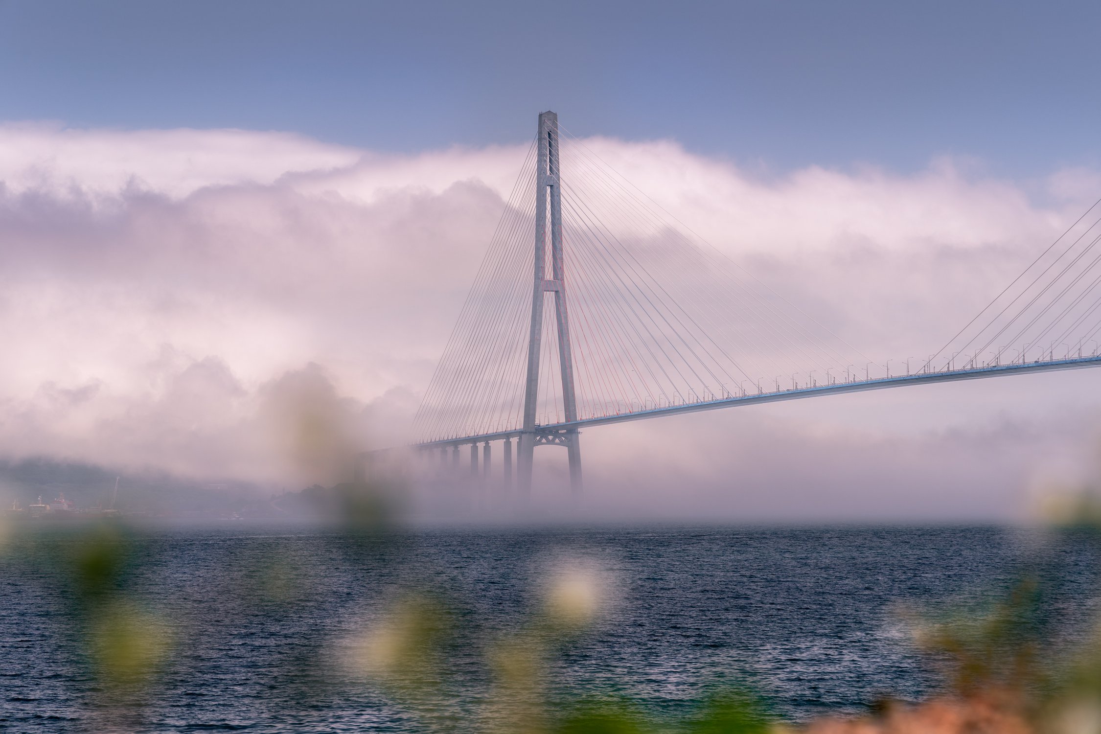 Облако тумана проходит по проливу Босфор Восточный, окутывая Русский мост, во Владивостоке.