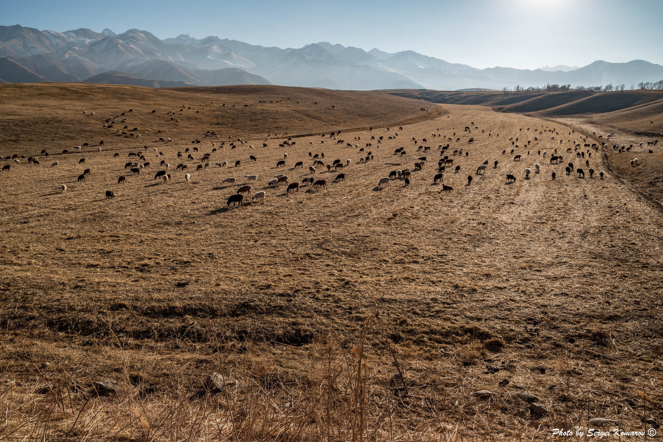 вид на горные просторы и на вернувшуюся с высокогорных джайлоо (пастбищ) на зиму отару нагулявших бока овец и баранов,