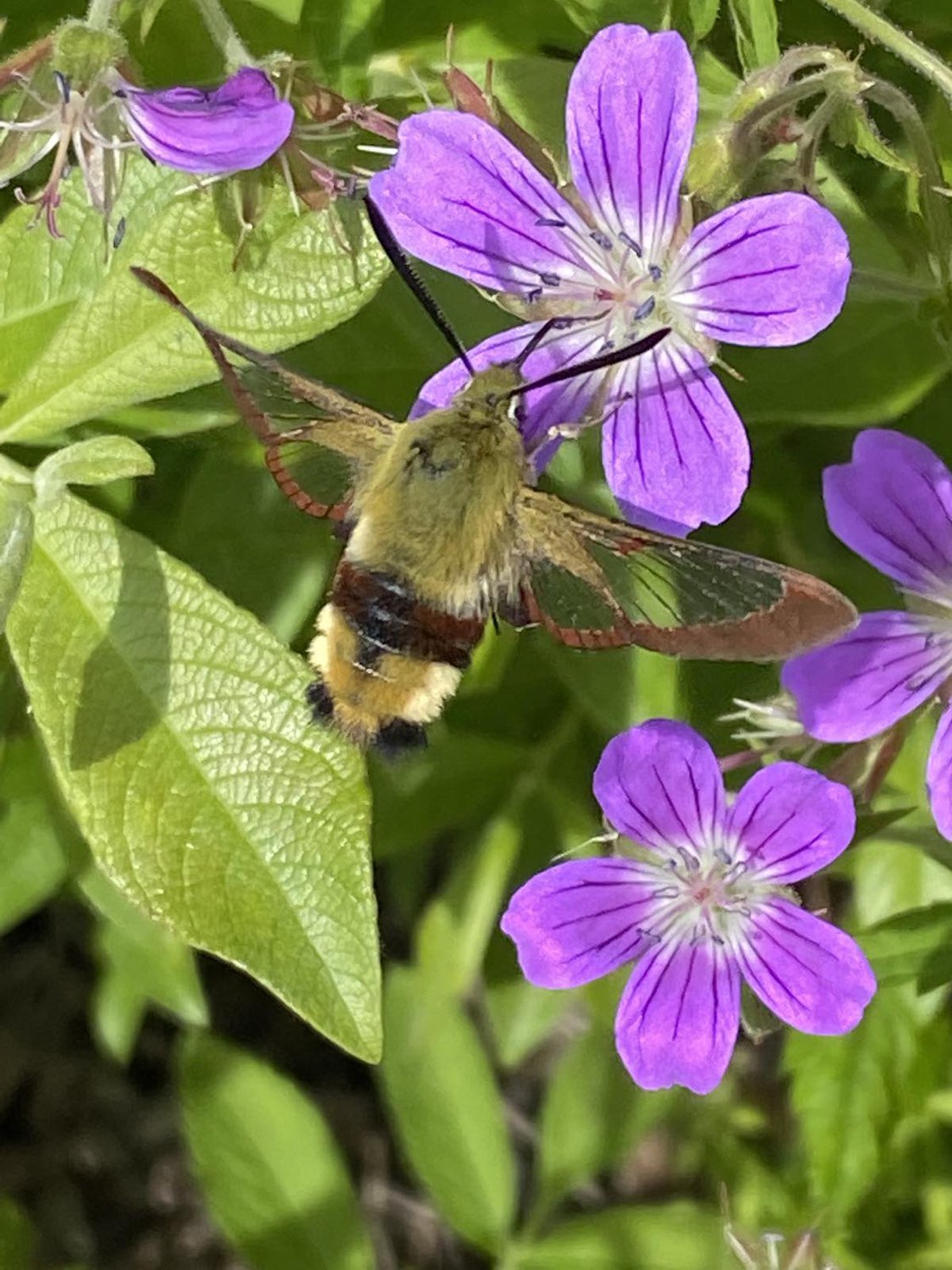 Шмелевидка жимолостная на лесной герани. Снято на айфон. Место съемки: Ханты-Мансийский район