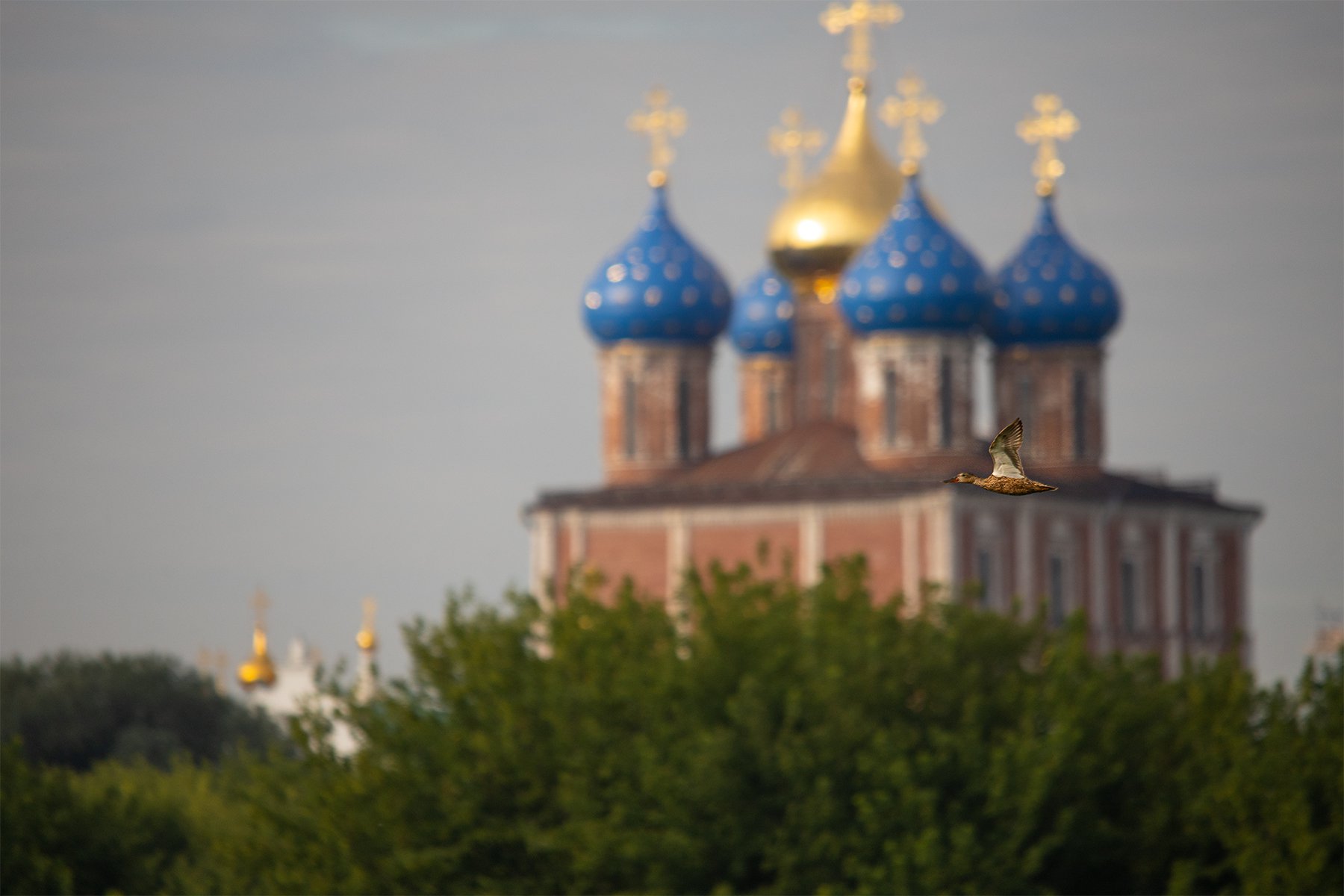 Широконоска самка пролетает на фоне Рязанского кремля
