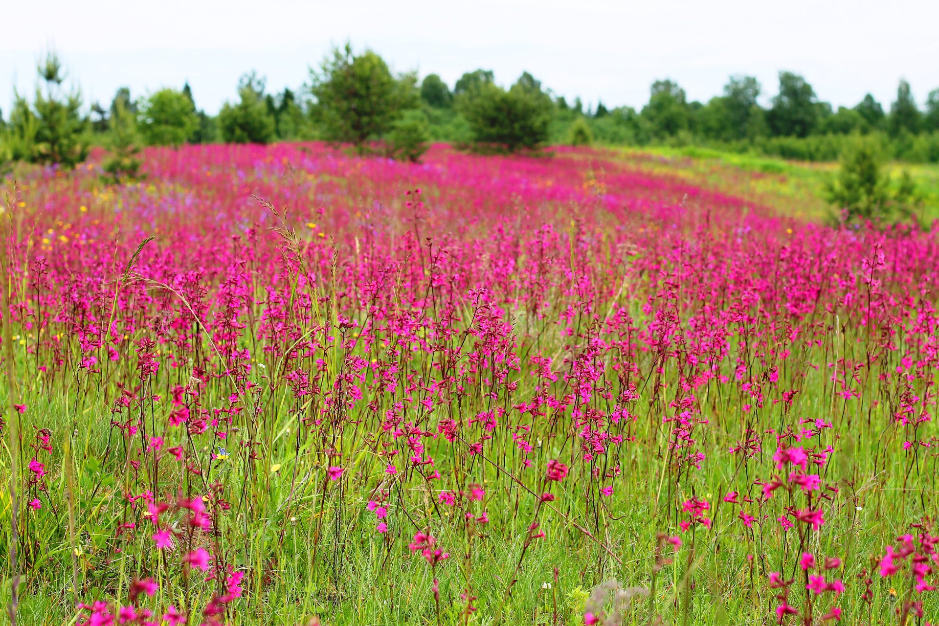 Красивые цветочные поля в июле в районе истока главной русской реки Волги в Тверской области.