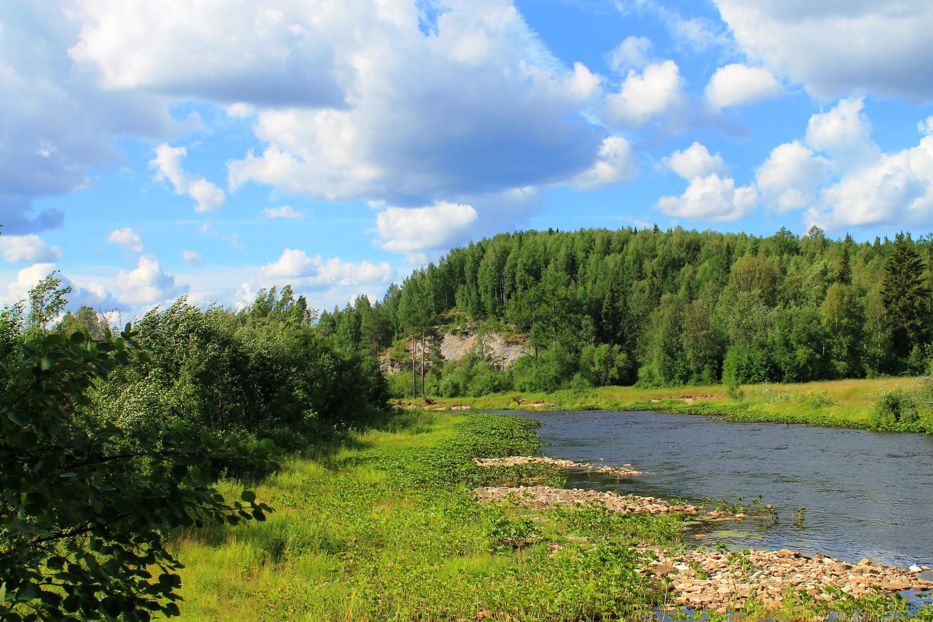 Республика Коми. Река Чуть. На заднем плане возвышенность, покрытая лесом. Солнце, облака, красота.