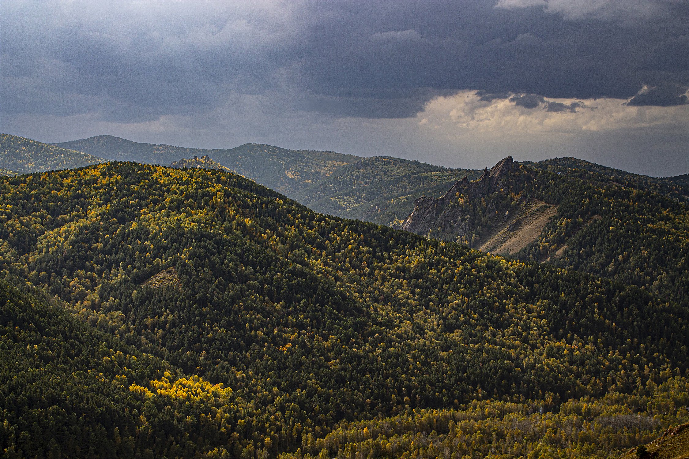 Вид на скалы Воробушки (вершина слева) и Такмак (скальный массив справа) с Торгашинского хребта.