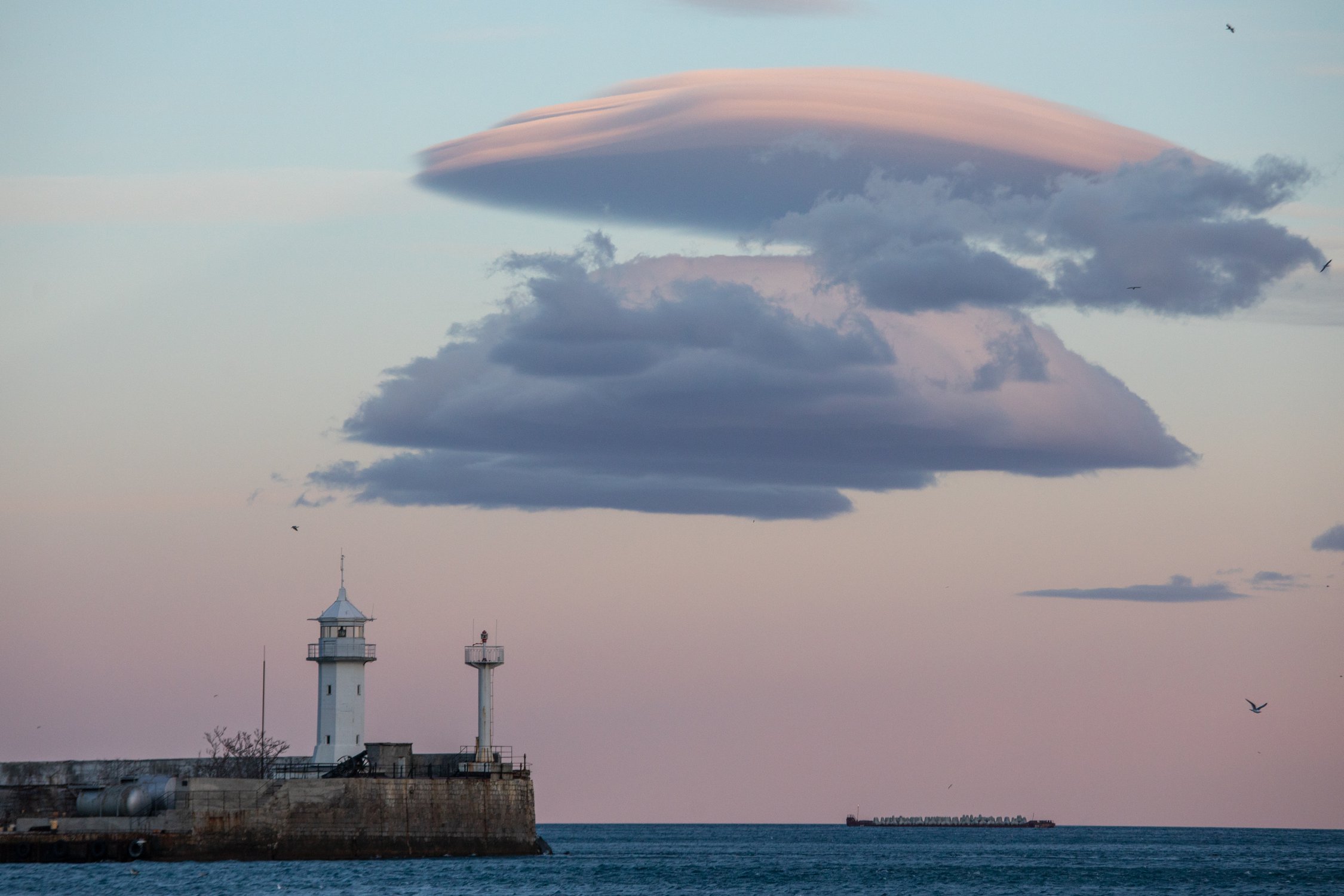 Лентикулярные облака на берегу Чёрного моря, город Ялта, Крым. Февраль 2021.
