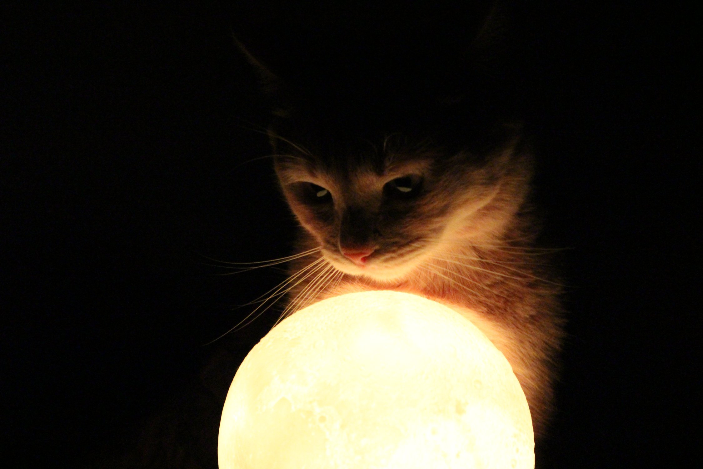 Фото сделано в октябре 2021г в г.Среднеуральск Свердловской области. На фото кот Батон изучает ночник «Луну». Его история: кот попал к нам в семью четвертым котом в возрасте 2х месяцев. Его матерью была бездомная кошка, которую зимой спасла моя знакомая. Кошка-матрёшка отблагодарила спасительницу 5 котятами. Все братья и сестры Батона были пристроены в семьи. В 2019г Батон «победил» МКБ и продолжает жить полноценной жизнью без рецидивов.