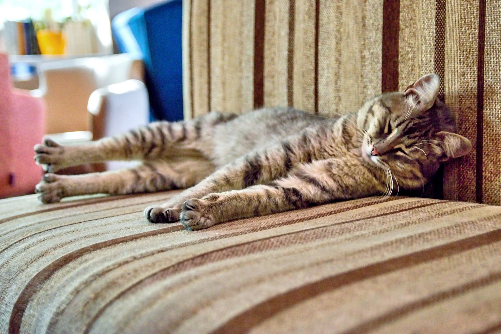 Этот котик был снят в кафе, зашли выпить по чашечке кофе, а тут вот такой уличный котик устроился на мягком диванчике.Фото было сделано 25.07.2020г