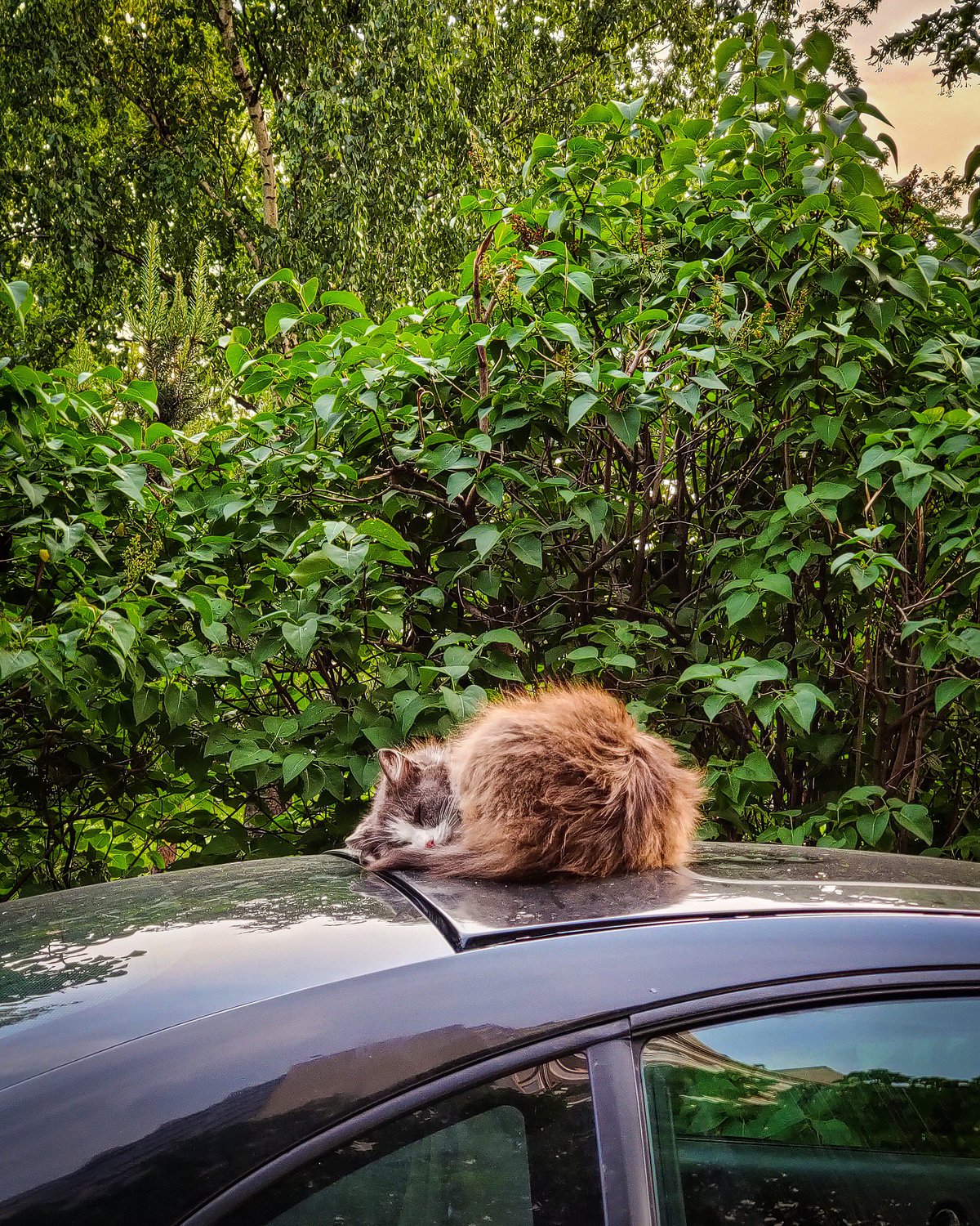 Уличный котик, уютно устроившийся на крыше автомобиля.