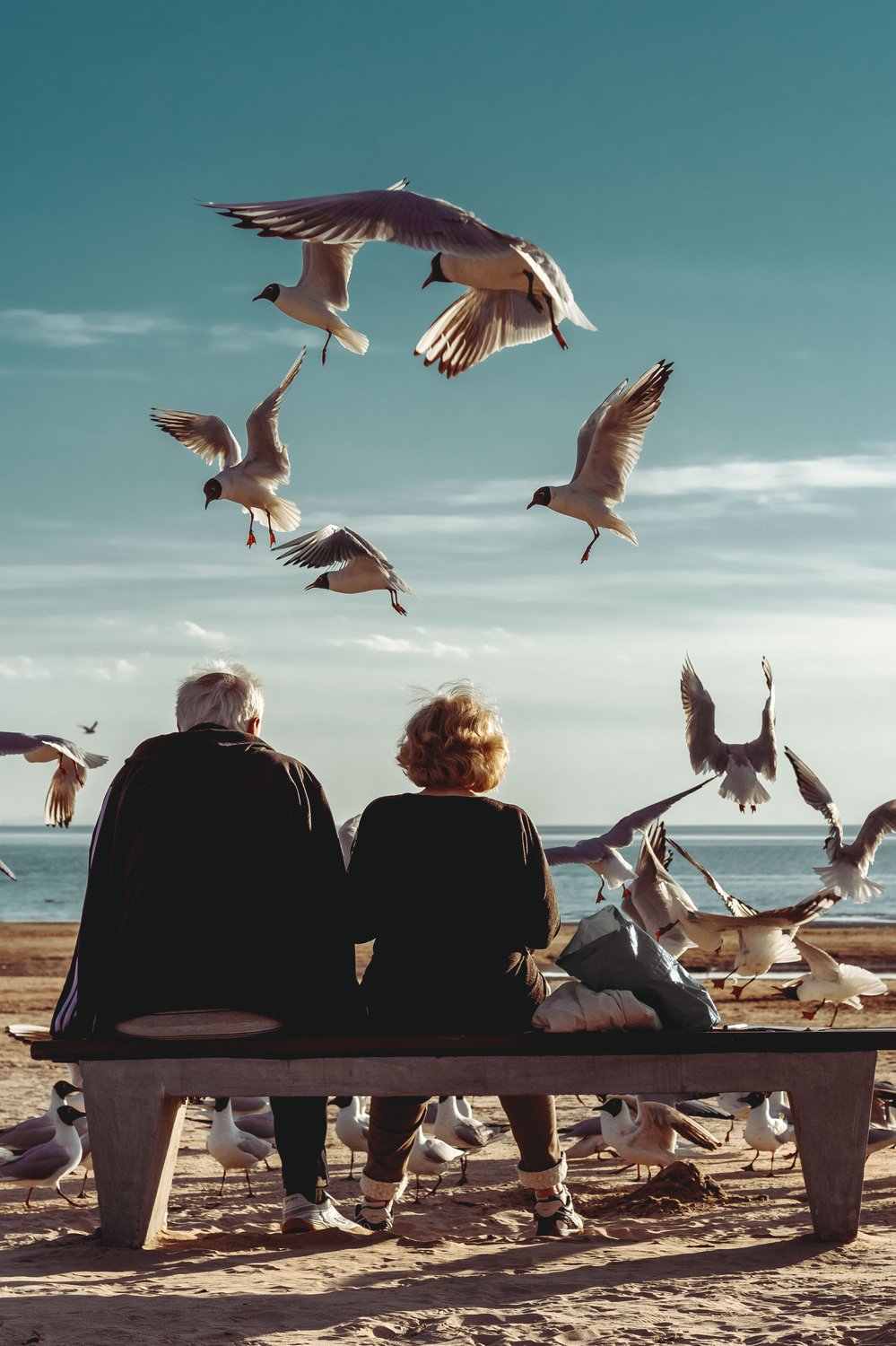 На снимке представлен образ пожилой пары, кормящей чаек в городе Стрельна, Ленинградской области.