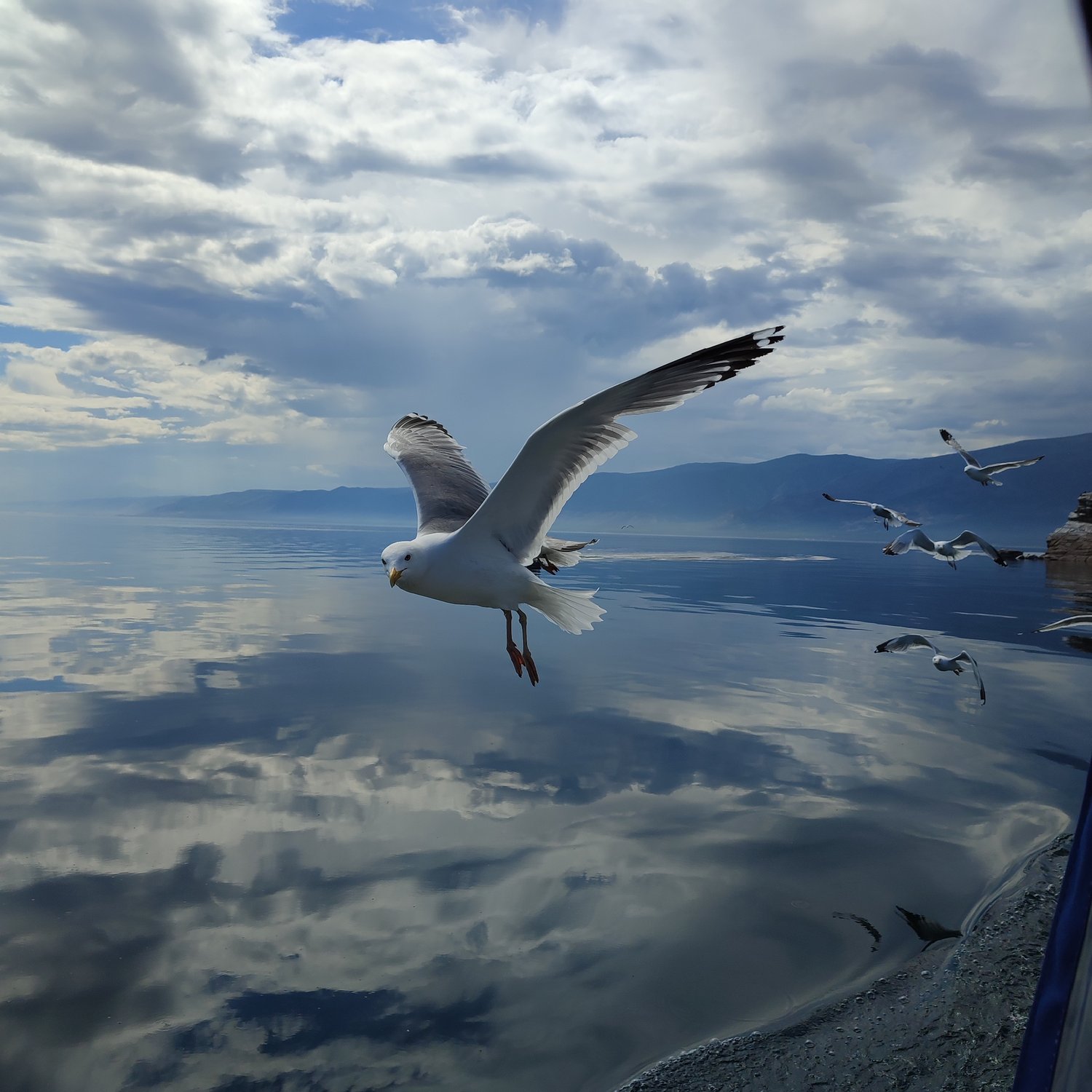 Водная экскурсия по Байкалу. На обратном пути кидали хлеб чайка - и одна чайка летела и прям в душу заглядывала с вопросом - А кормить меня когда будут?