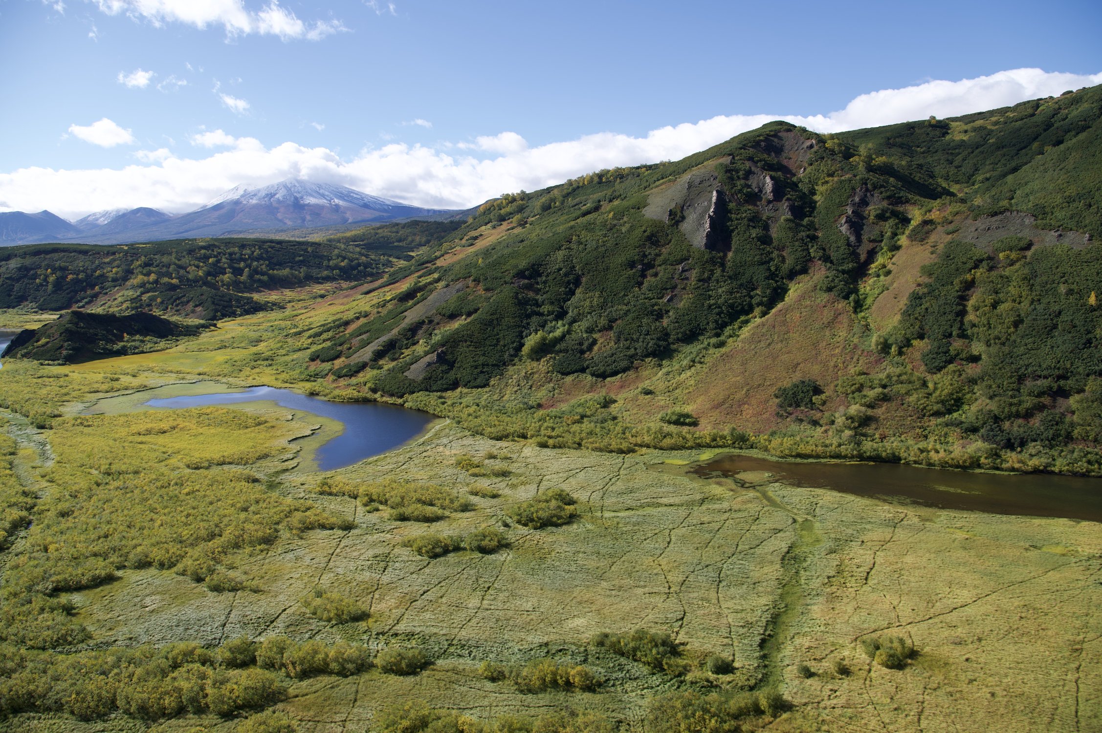 Камчатка, сентябрь 2022. На фото - линии, напоминающие пунктир, это - медвежьи тропы, ведущие к реке, богатой рыбой. Перед долгой зимой и спячкой, медведи должны быть сытыми