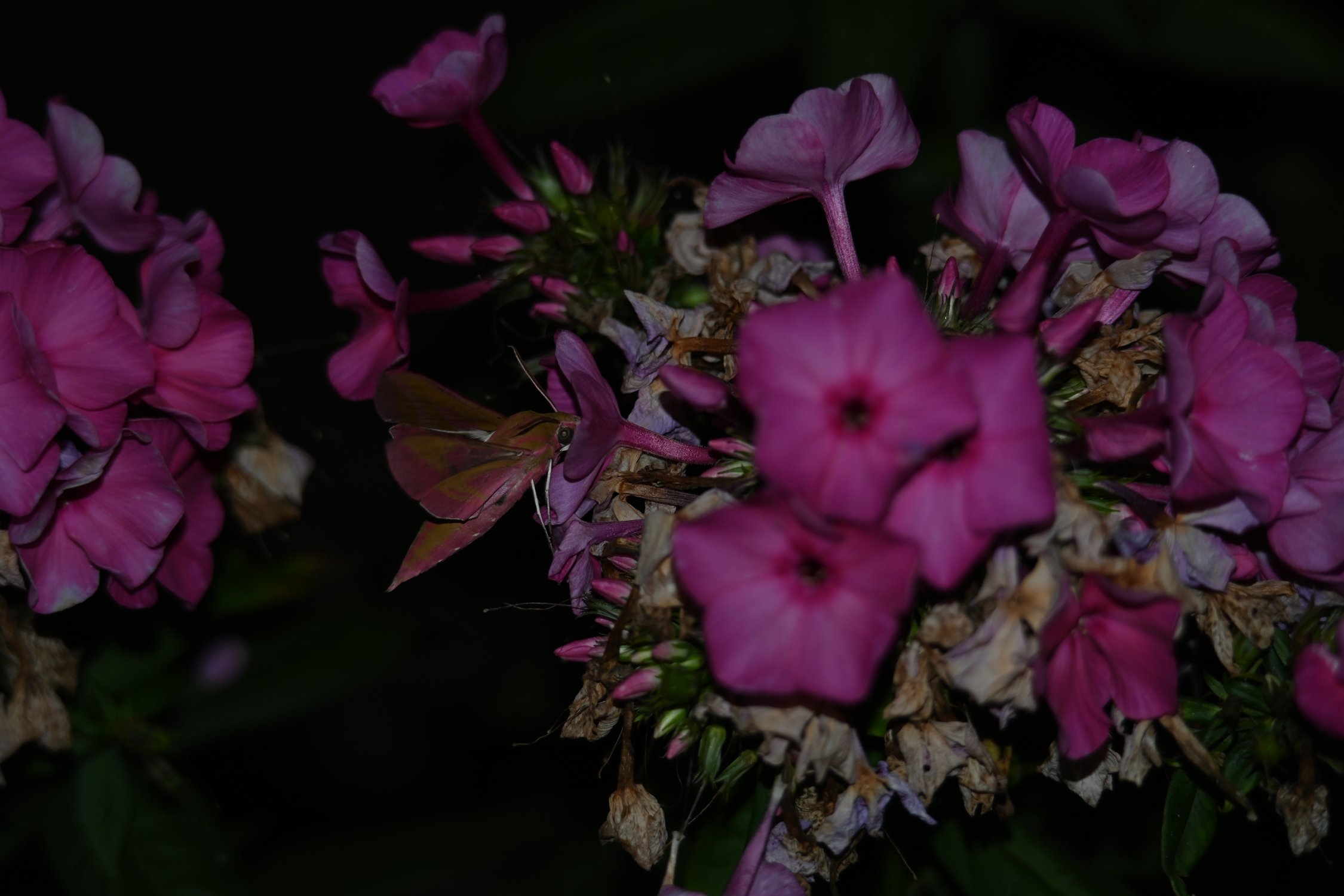 На фотографии изображен бражник, который по ночам порхает от цветка к цветку, на лету собирая нектар тонким хоботком.