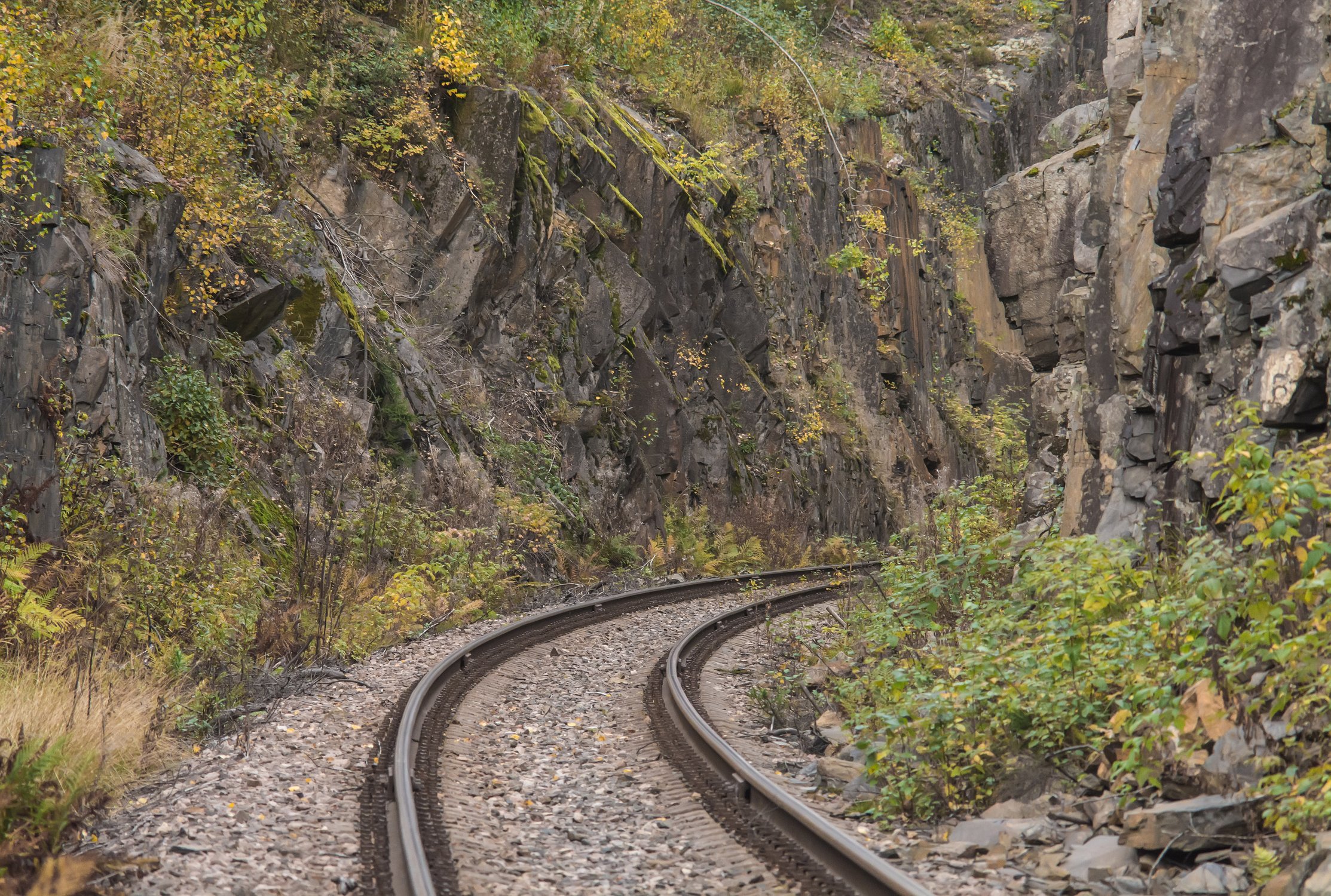 Железнодорожный путь проложен среди скал в железнодорожной выемке в районе посёлка Ляскеля (Карелия, север Ладожского озера).