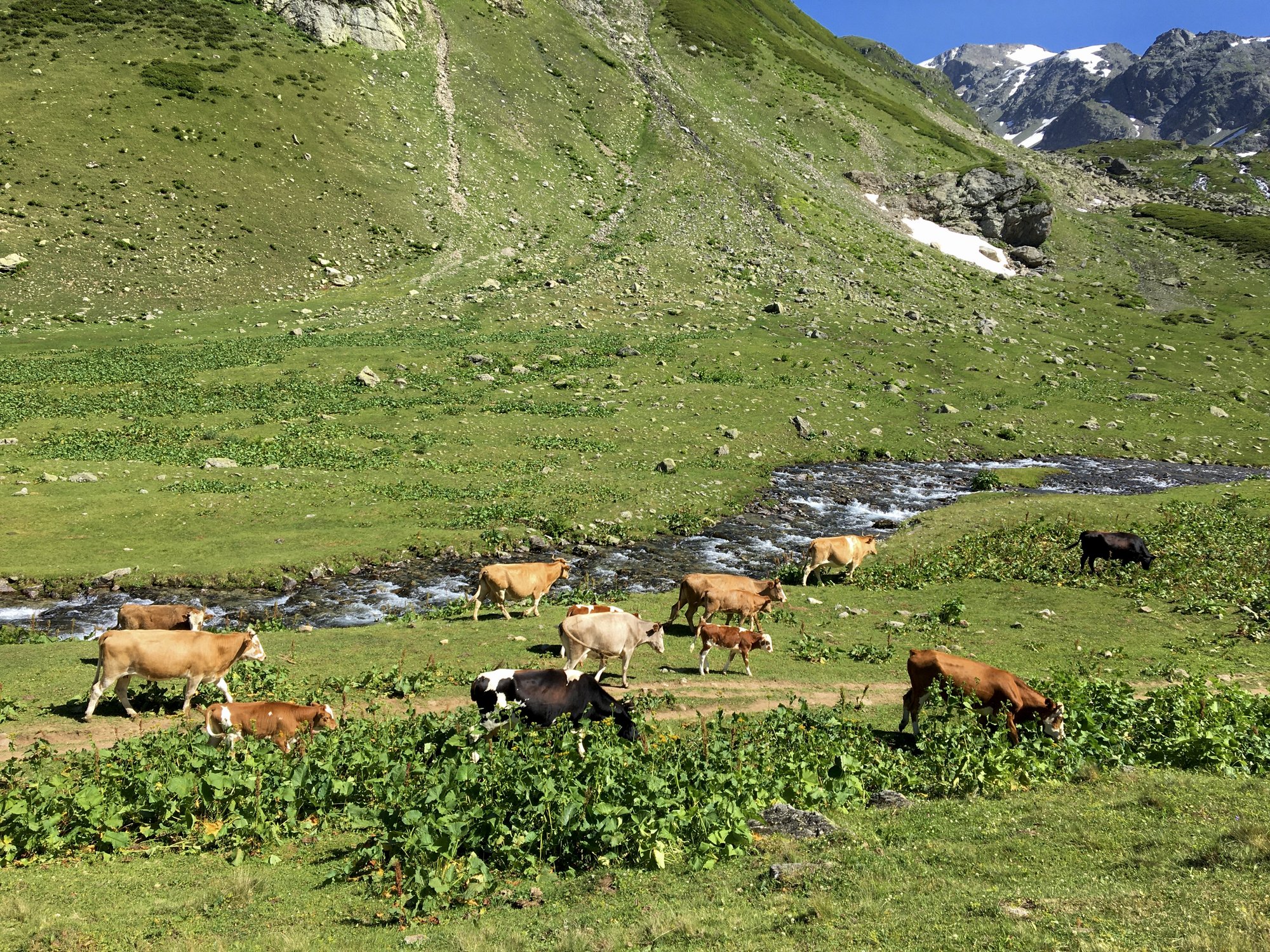 Стадо коров ленно бродит по зарослям дикого щавеля на берегу реки по пути на озеро Семицветное в Архызе