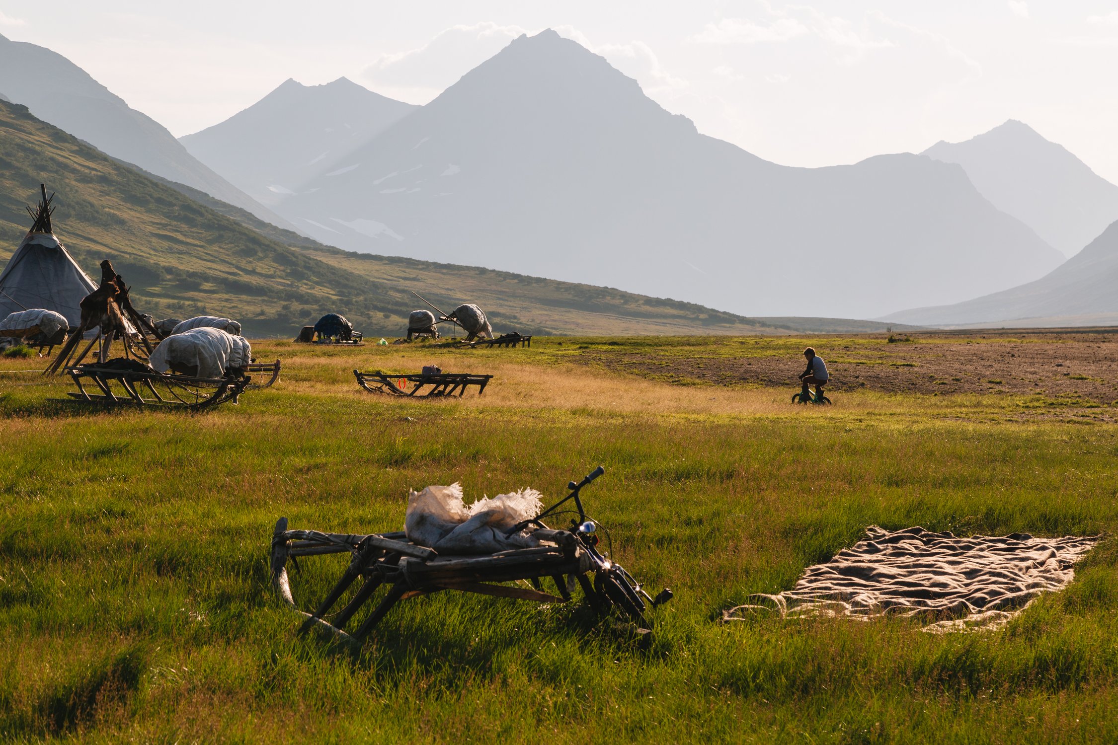 Мальчик катается на велосипеде у стойбища оленеводов на Полярном Урале в ЯНАО