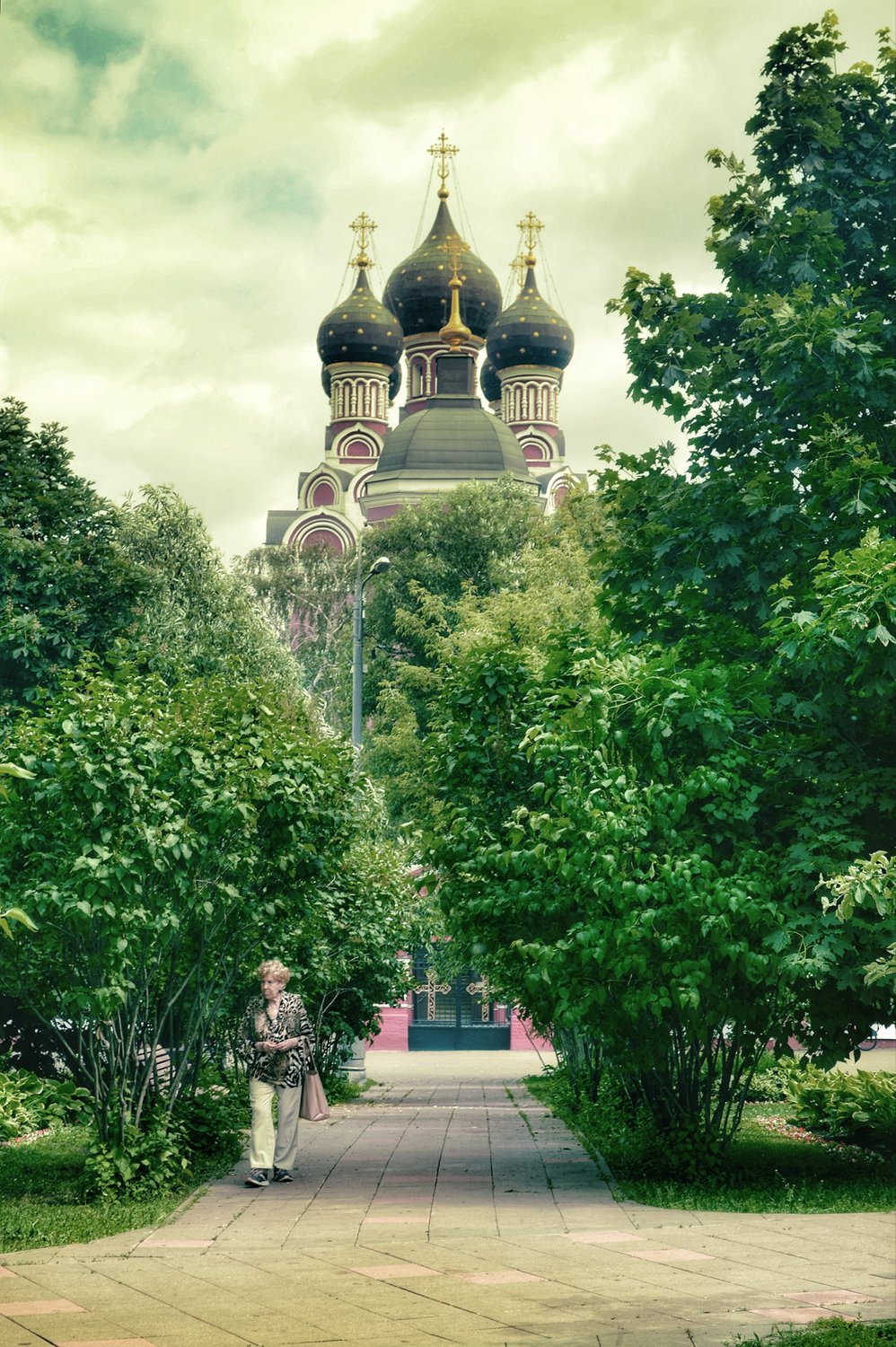 Ранее утро, женщина прогуливается по парку на фоне храма