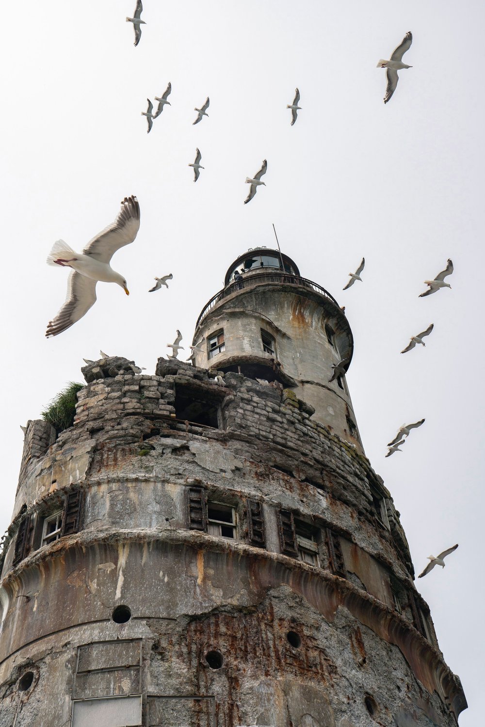 На фоне бескрайнего океана, покрытого легкой дымкой, возвышается заброшенный японский маяк, выступающий из окружающей природы как устремленный в небо страж. Воздух наполнен криками чаек, которые плавно кружат вокруг маяка, создавая живописное сочетание дикой природы и человеческого творения. Теперь они новые жильцы маяка.