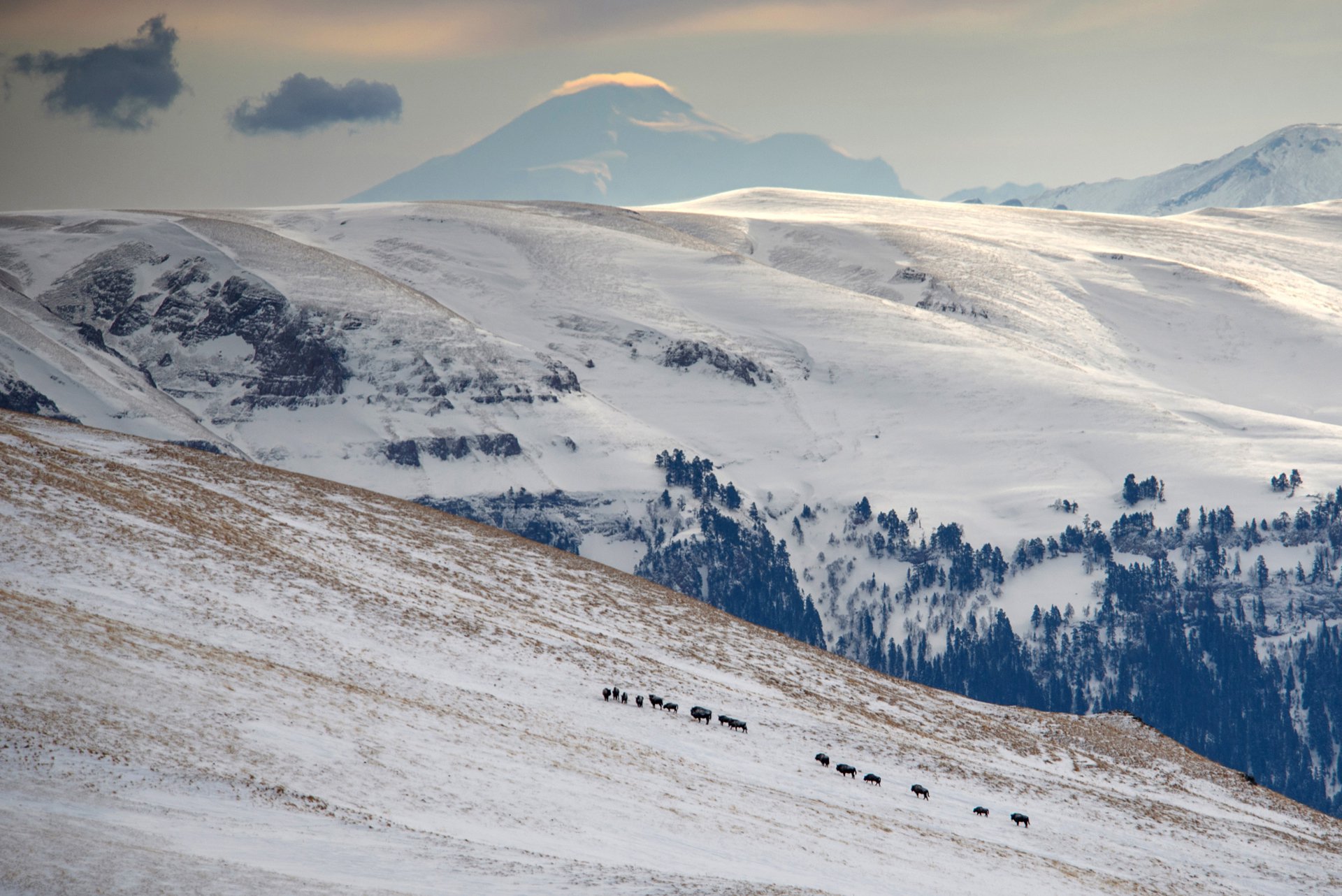 В зимнюю пору зубры большими группами по 100-150 особей держатся на открытых пологих травянистых склонах. Ветер сдувает с этих склонов снег, обнажая прошлогоднюю траву, которой и питаются зубры. Хребет Солонцовый, Кавказский заповедник. А на заднем плане возвышается далекий Эльбрус - чистый зимний воздух позволяет видеть его за две сотни километров по прямой.
