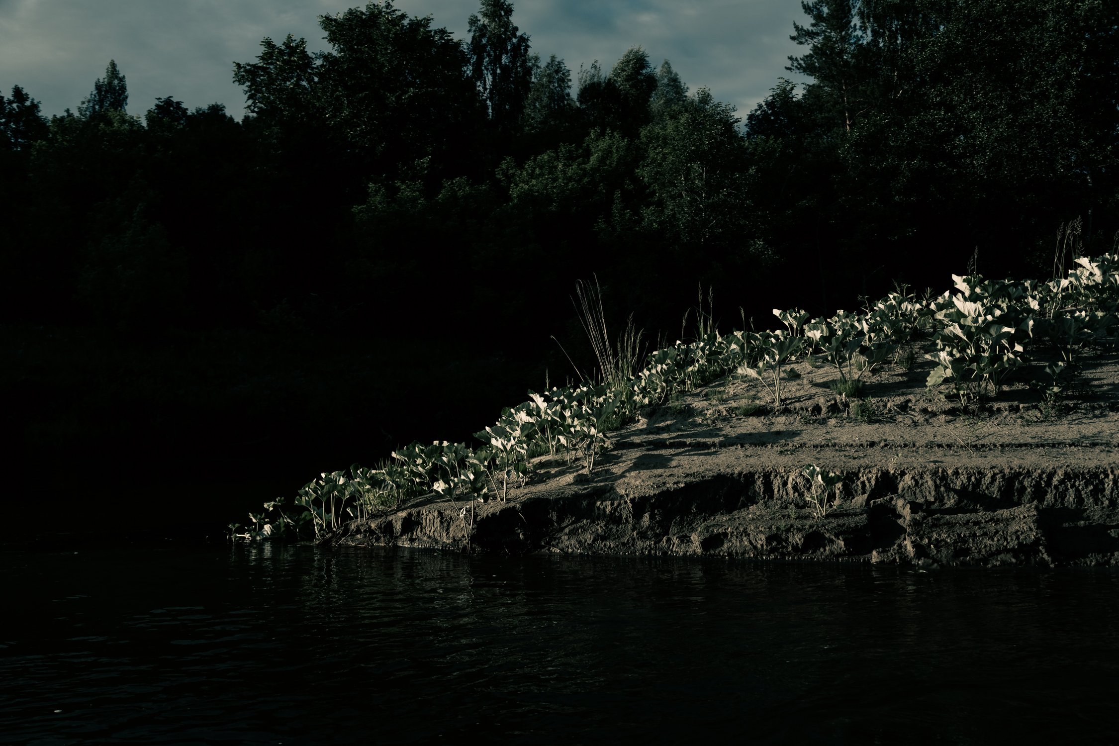 Река Илеть, Марий - Эл. Солнечный луч выхватил песчаную косу из темноты. Травы светятся, словно фосфорные. Ощущения нереальности.