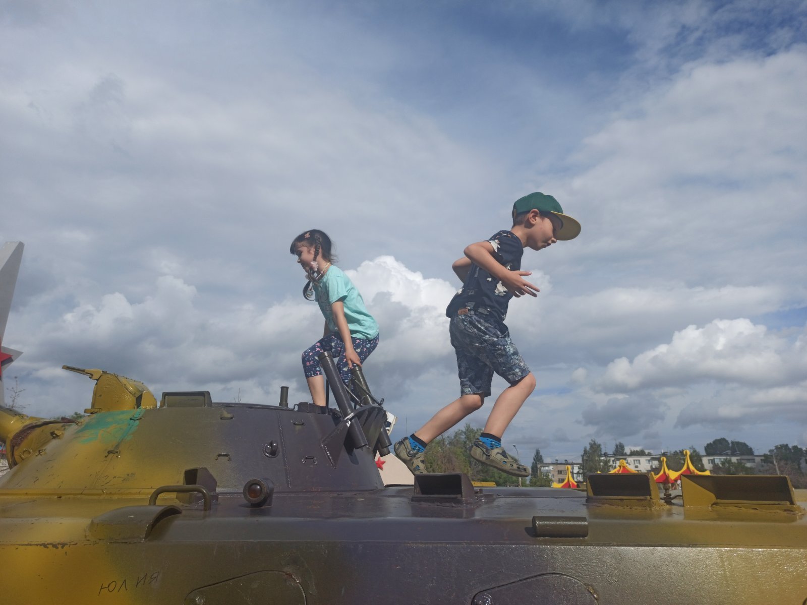 Приехав в город, мы встретили дорогих друзей, приехавших на две недели к нам из Парижа, и пошли гулять в парк. Дети сразу нашли себе танк у входа и, конечно, залезли на него. "Детство, детство, ты куда бежишь?"