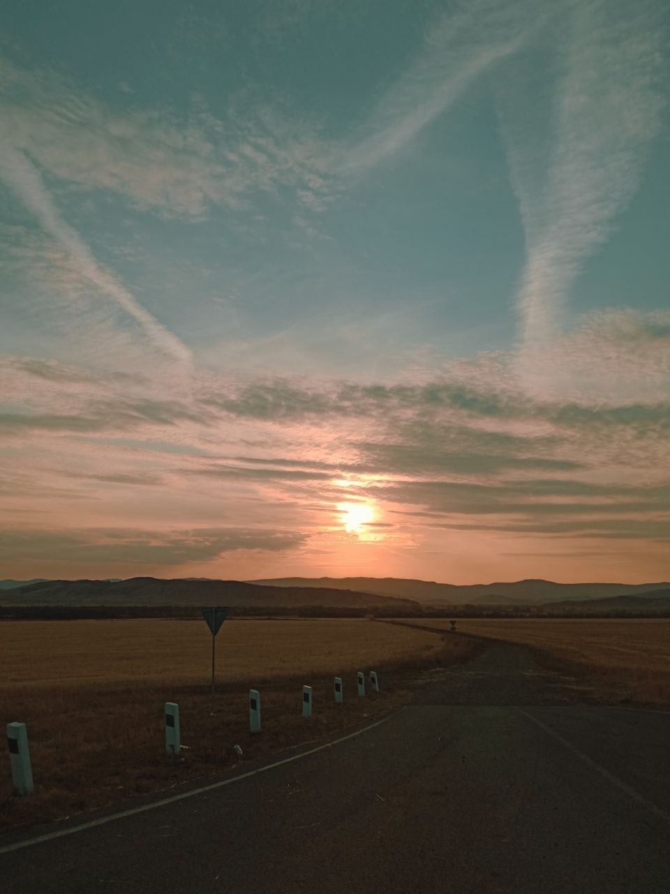 Дорога в Башкирии. С шоссе дорога плавно переходит на сельскую и ведёт к Уральским горам, покрытым лесом.