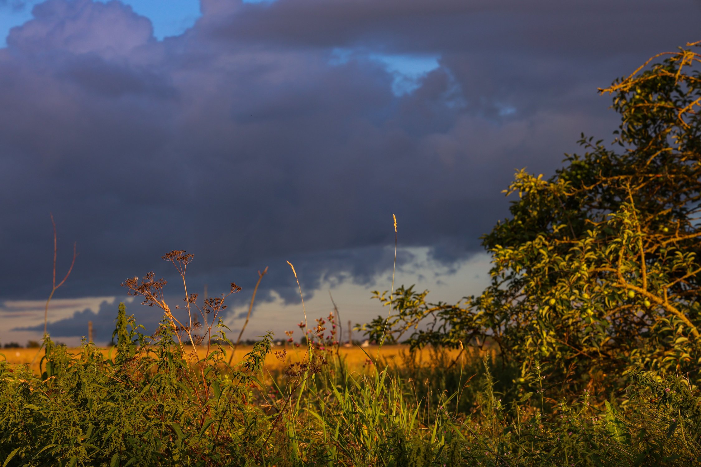 Поле в лучах закатного солнца, пробивающихся сквозь грозовые тучи, в Гатчинском районе Ленинградской области
