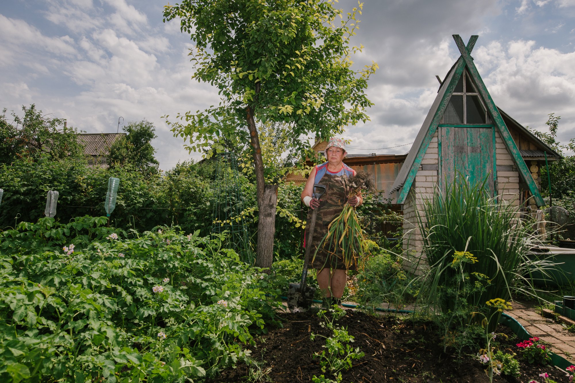 На этой фотографии моя мама в процессе сборки урожая чеснока в июле 2024 года. На Южном Урале это лето выдалось чрезвычайно дождливым, поэтому урожай собирали раньше обычного.