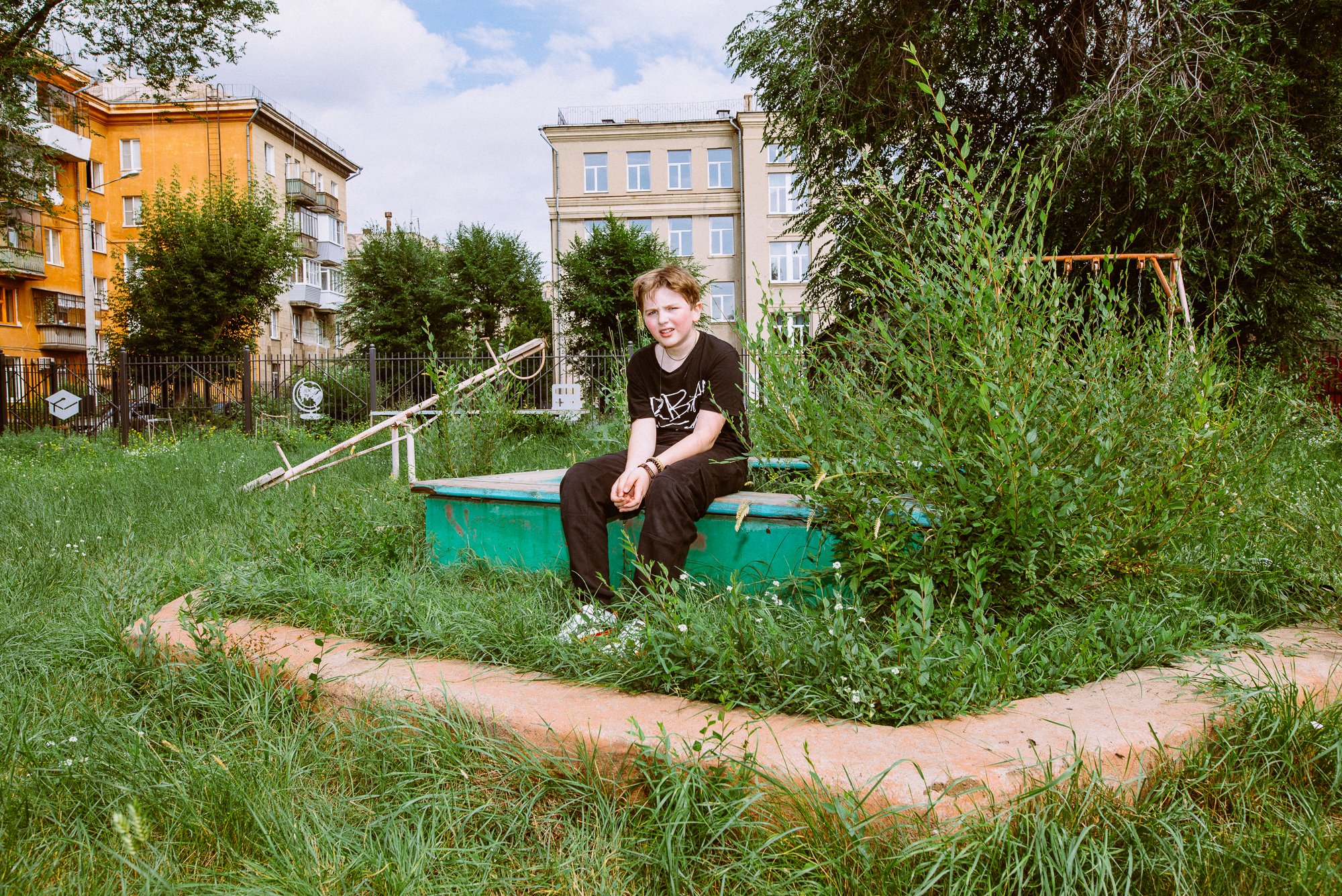 На снимке мой сын на старой детской площадке, на которой я гуляла в детстве. На заднем плане школа, где я училась много много лет назад.