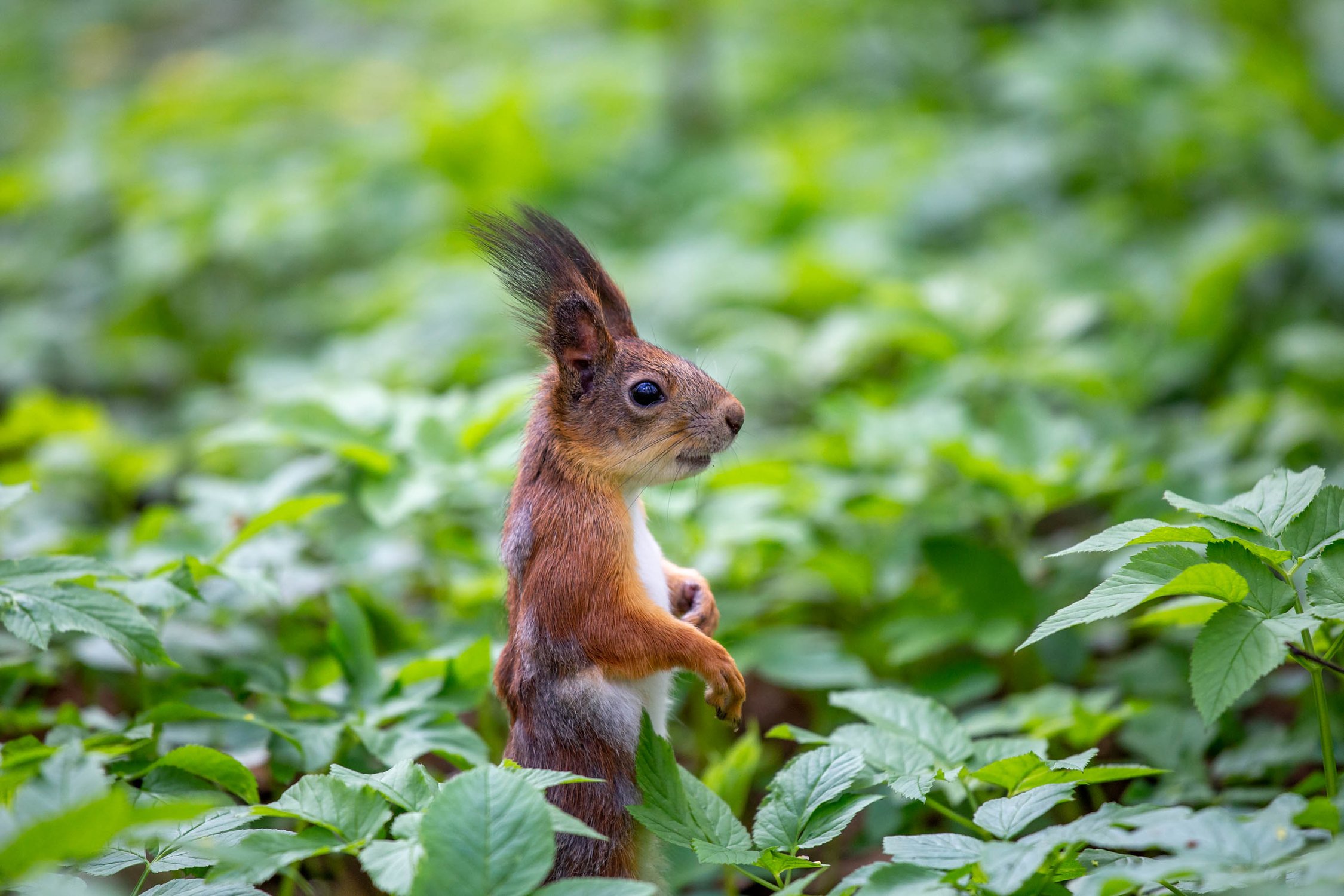 На зеленой опушке, заметила, как белочки то и дело выглядывали из под листвы, как будто играя в прятки, одну из них удалось поймать в кадр