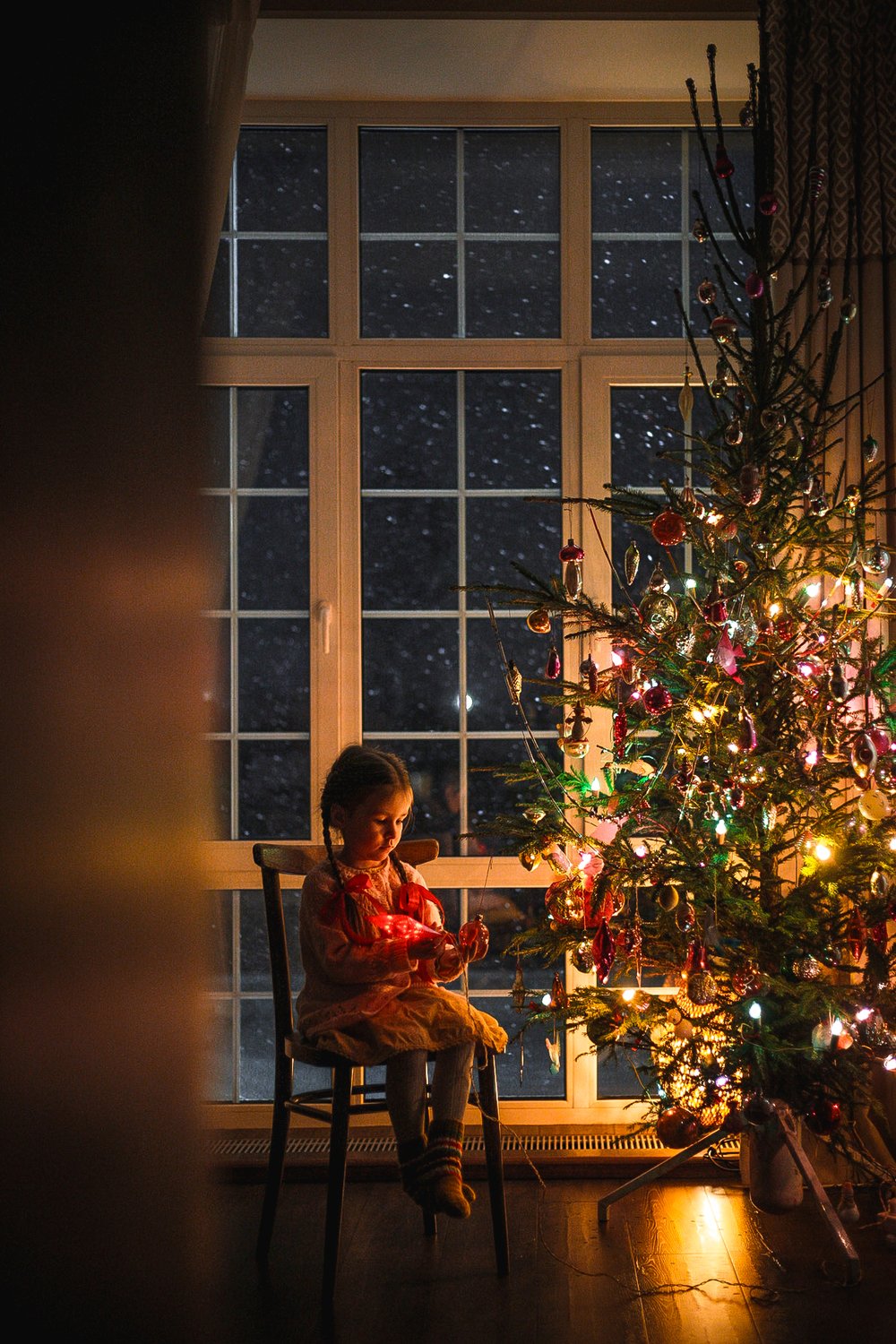 3 января 2023 года, Карсун, Ульяновская область. Решили с младшей дочкой, что на нашей ёлочке, украшенной советскими игрушками, не хватает звезды. Но надеть ее на макушку оказалось не так-то просто:) малышка присела отдохнуть, а за окном пошел снег. Так и получился этот кадр, согретый теплом уютного зимнего вечера.