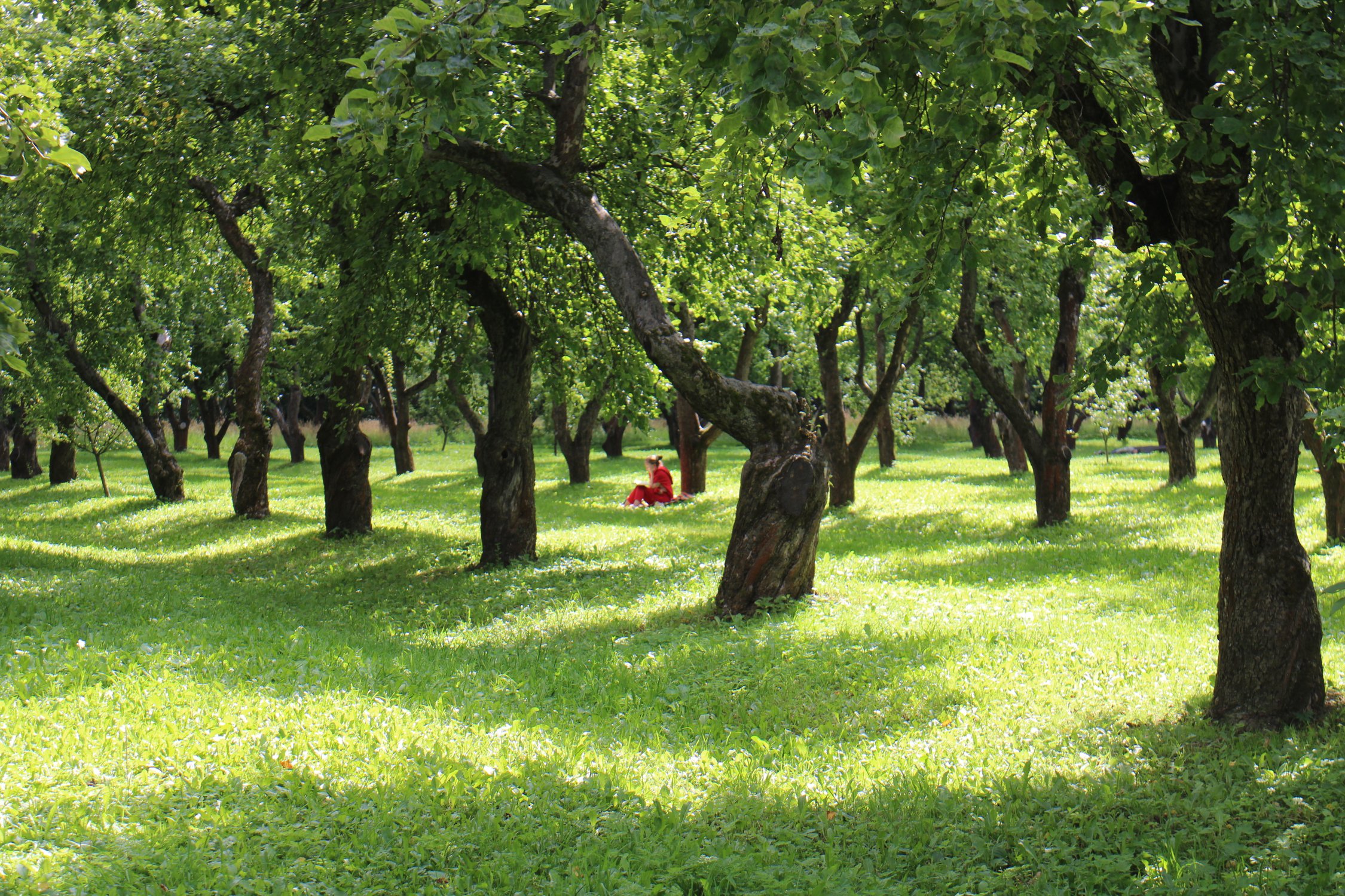 В музее-усадьбе Коломенское наблюдали эту умиротворяющую картину: девушка в красном, расположившись под яблоней и спрятавшись от солнечных бликов, увлеченно читает и не обращает ни на кого внимания. Привлек внимание цвет ее одежды.