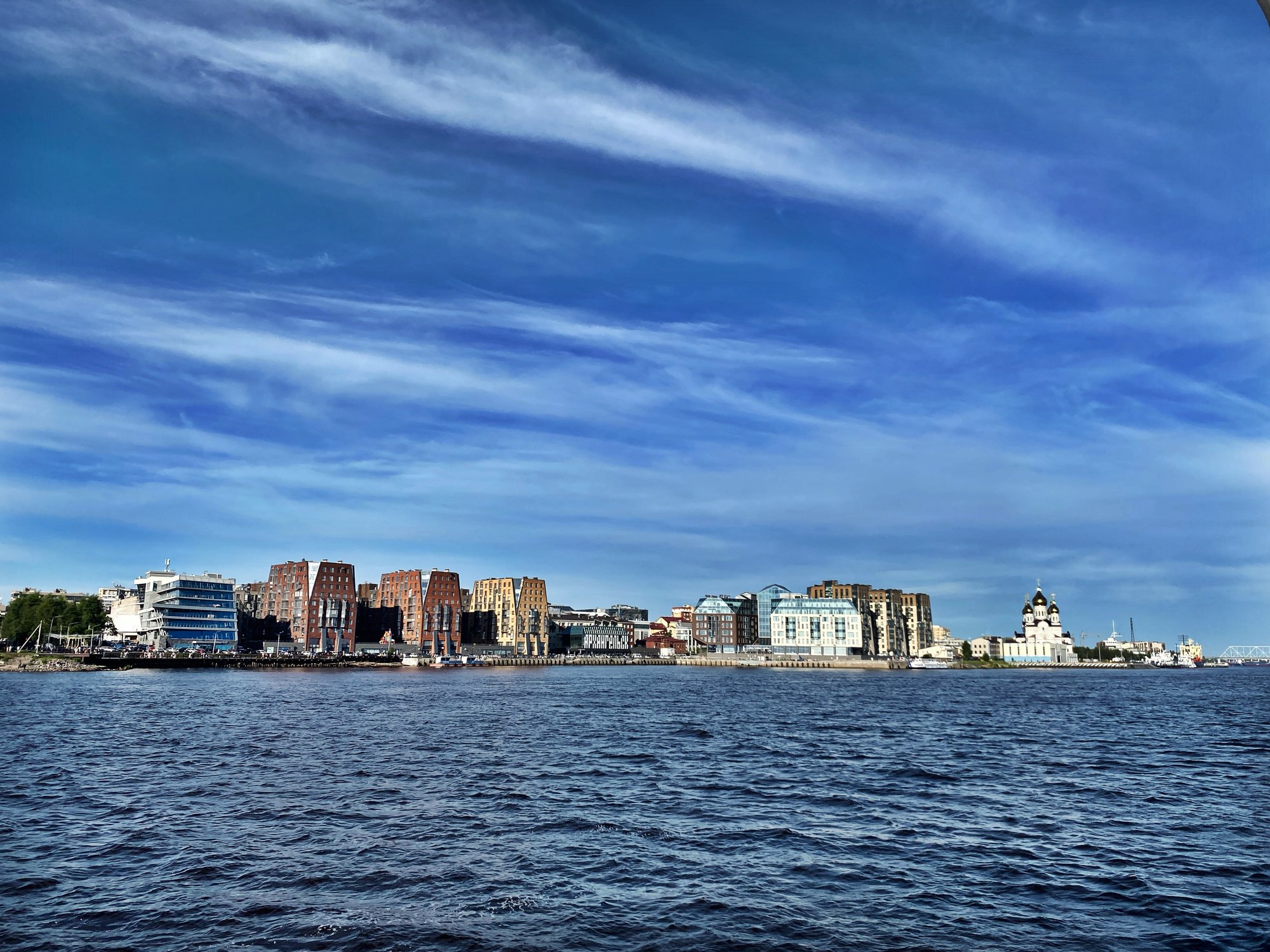 Немыслимое сочетание городского современного Урбана в европейском стиле и классической русской церкви, приглушенное спокойствие воды.