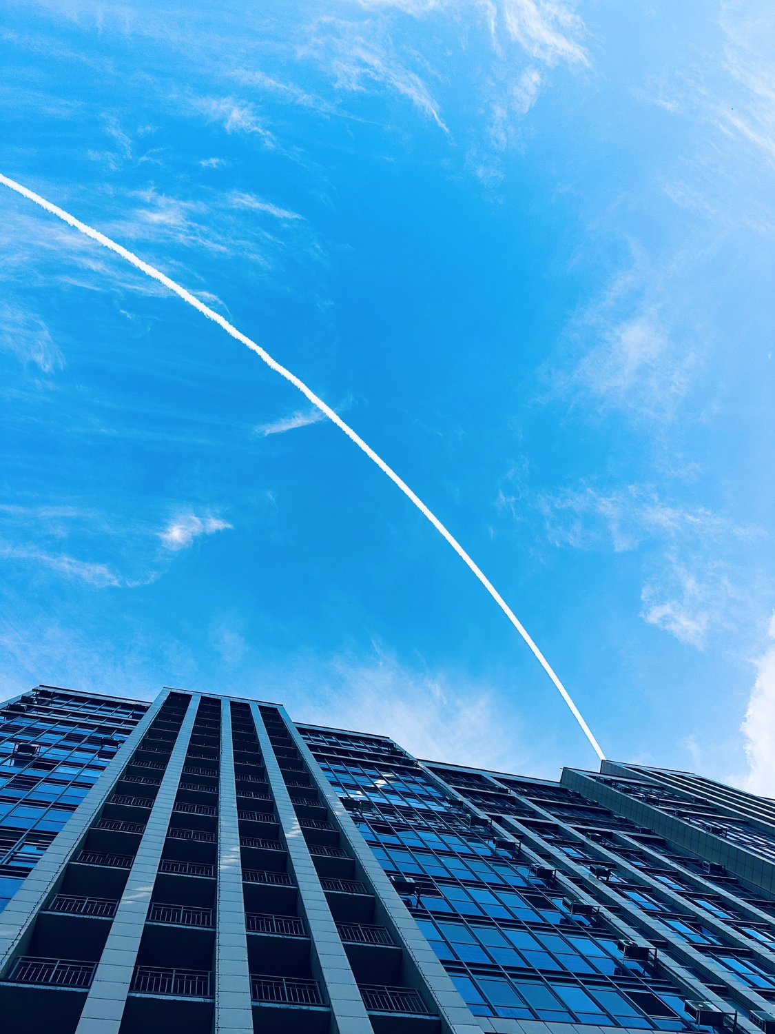Словно циркулем прорисован полукруг на небе, оставленный самолетом.