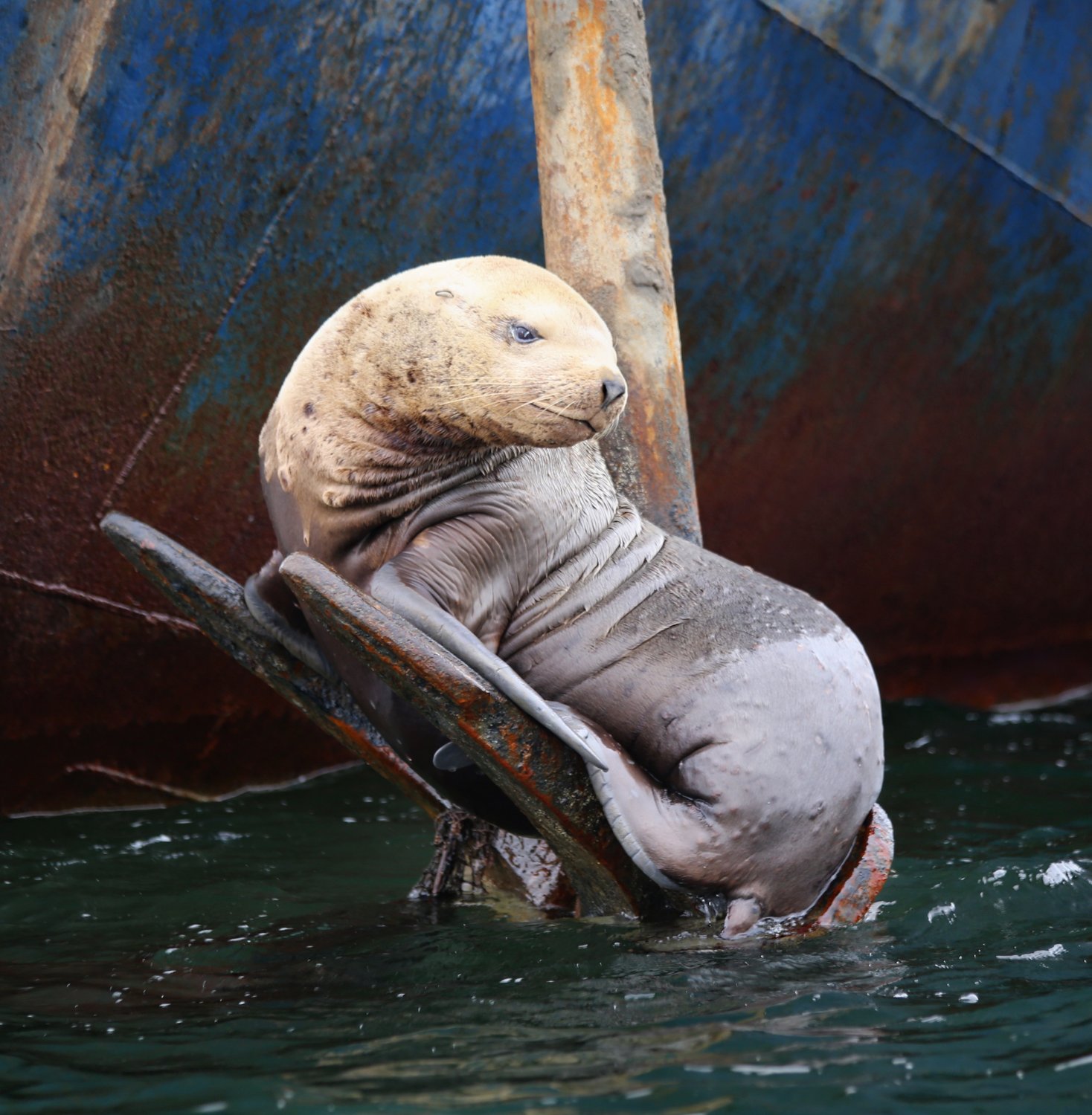 Однажды в б. Нагаева г. Магадана на якорь залез сивуч. Нетипичное поведение для этих великанов. На некоторых островах в Охотском море есть лежбища этих краснокнижных красавцев, а вот бухту находящуюся в городской черте они редко балуют своим присутствием. Мне повезло запечатлеть этот знаменательный момент.