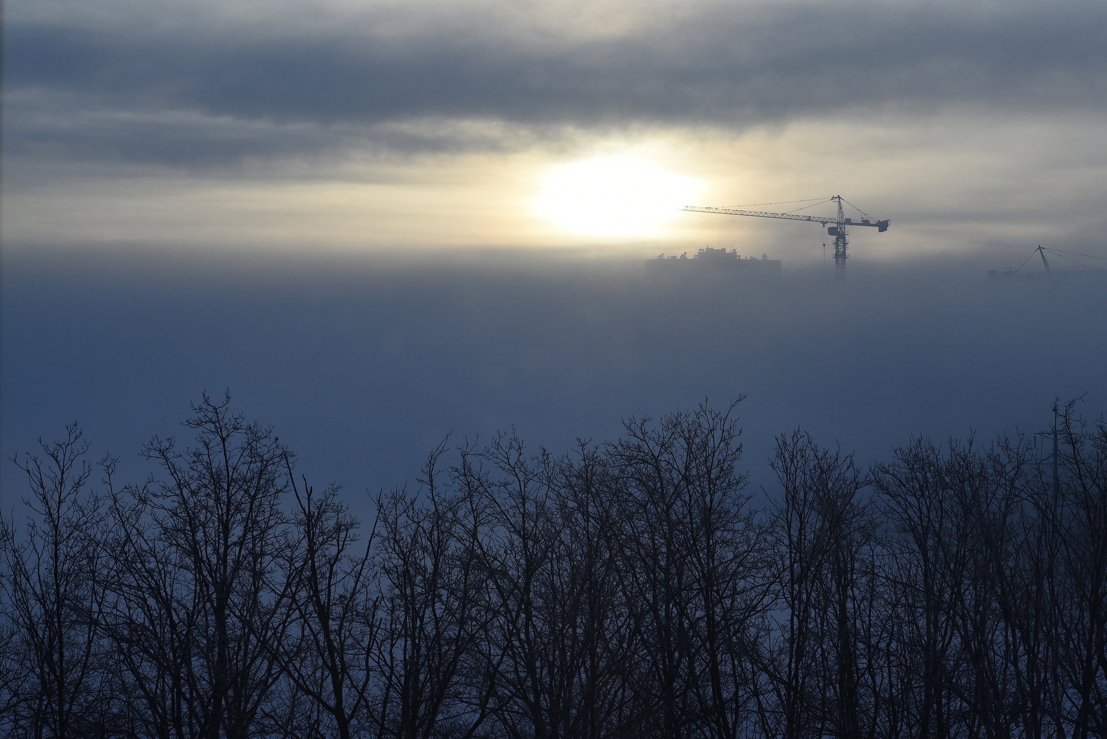 Туман, опустившийся на город однажды утром, скрыл все новостройки, оставил только два одиноких крана, которые строят свои воздушные замки где-то высоко в облаках.