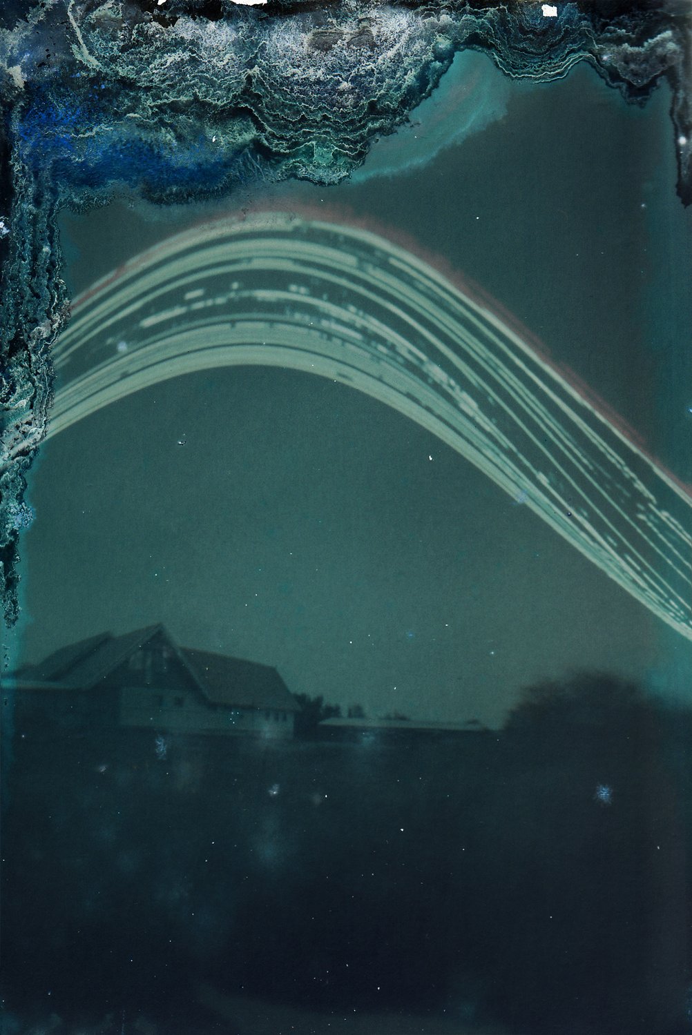 Соларография, снятая с помощью камеры-обскуры. Траектория движения солнца в июле месяце над родительским домом в деревне Лебедино, Татарстан.
