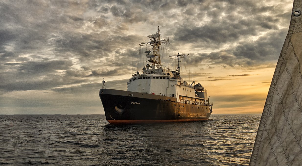 Проходя на яхте мимо корабля по Белому морю. Соловки.