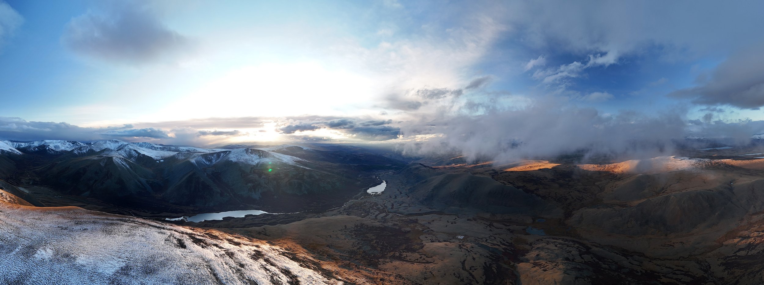 Кош-Агачский район. Недалеко от перевала Теплый ключ. Пробивающийся сквозь облака закат над ущельем реки Джумалы.